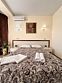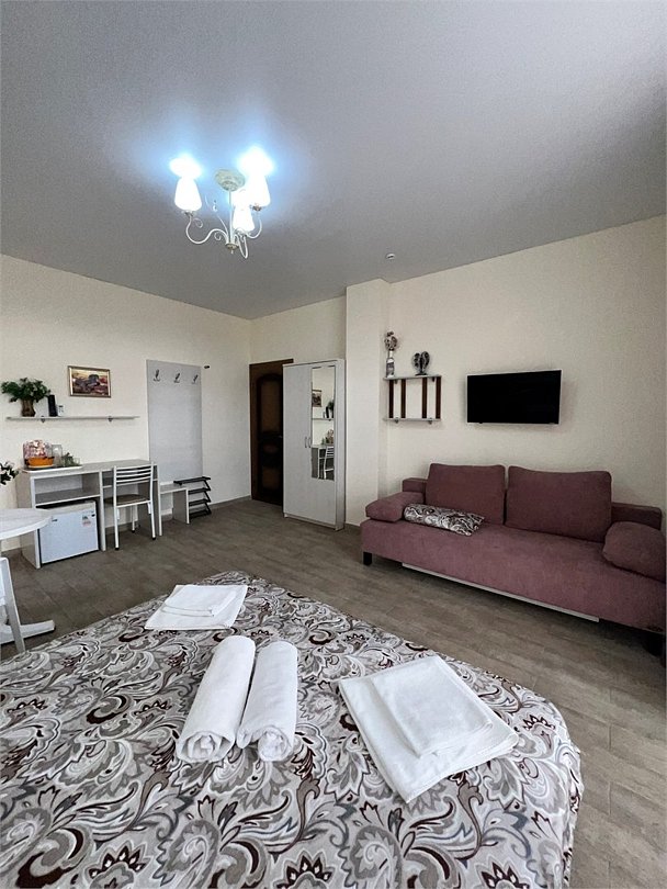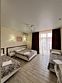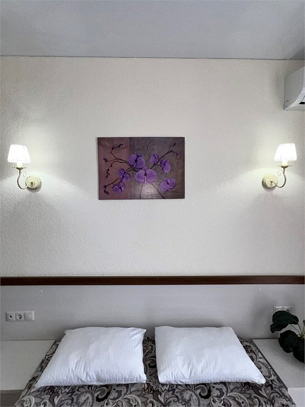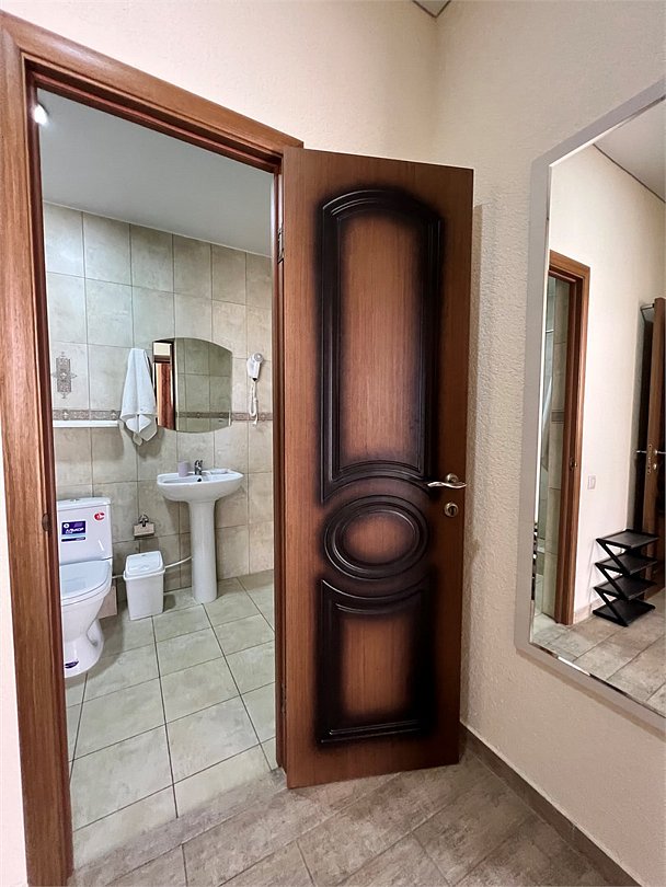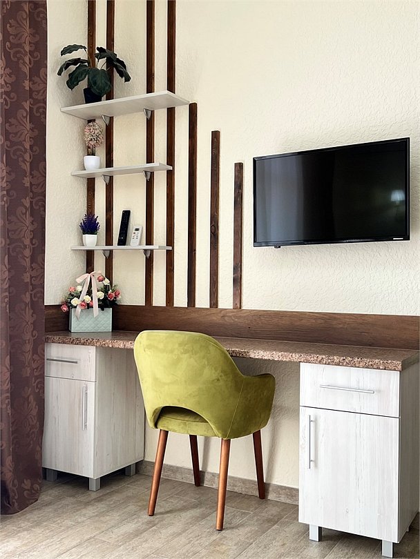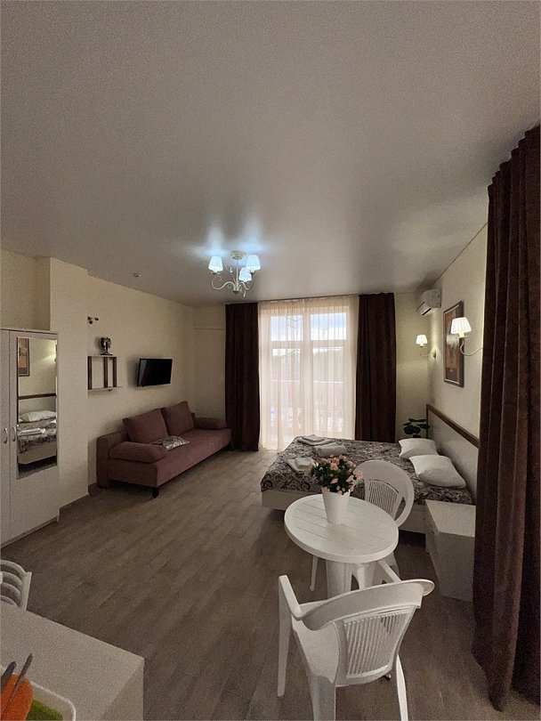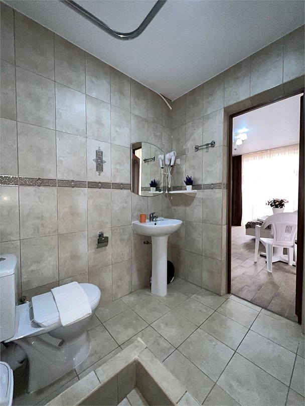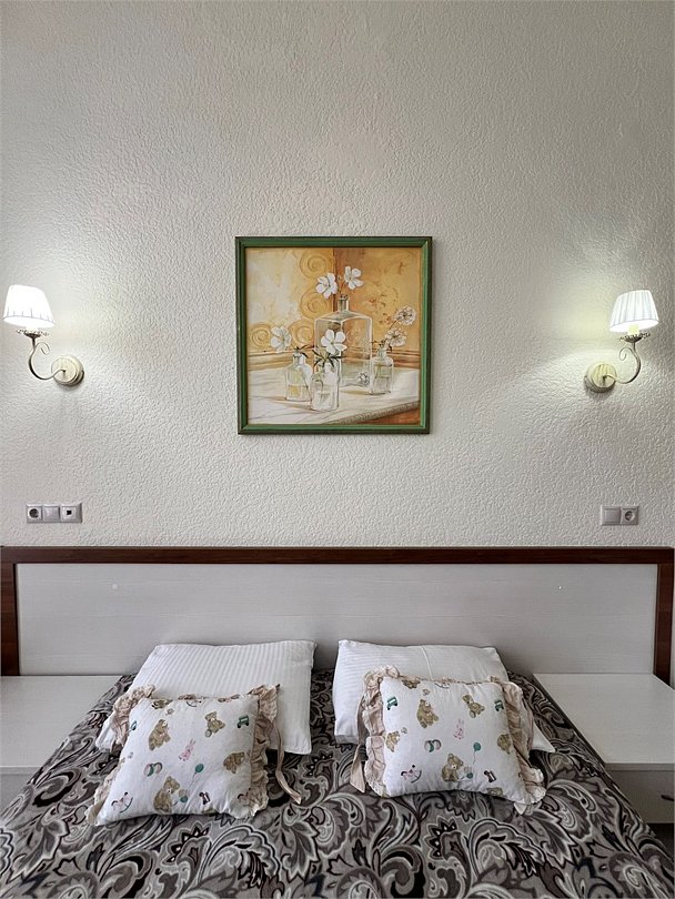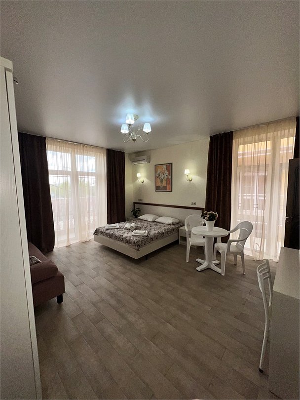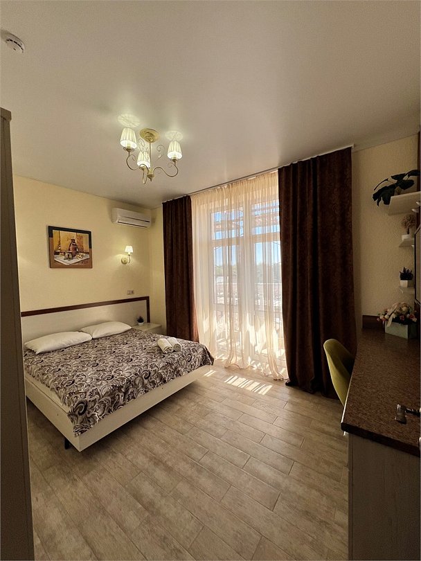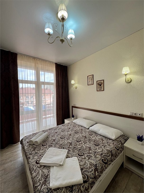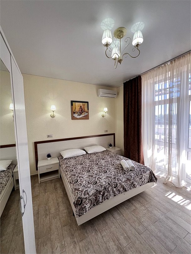 Номер площадью 27 м², размещение до 4 человека. Состоит из комнаты, санузла, и двух балконов. Оснащен одной двуспальной кроватью и двуспальный раскладной диван-кровать, мини холодильник, телевизор, шкаф, прикроватные тумбы, стол, стулья, туалетный столик также различные полочки для удобства наших гостей. Есть собственная душевая комната с санузлом, фен, полочки, ершик, мыло, полотенца.Услуги и удобства