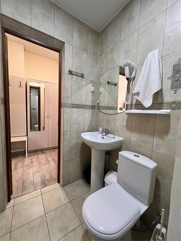 Номер площадью 27 м², размещение до 4 человека с возможность доставить раскладушку. Состоит из комнаты, санузла. Оснащен одной двуспальной кроватью и двумя односпальными кроватями, мини холодильник, телевизор, шкаф, прикроватные тумбы, стол, стулья, также различные полочки для удобства наших гостей. Есть собственная душевая комната с санузлом, фен, полочки, ершик, мыло, полотенца.Услуги и удобства