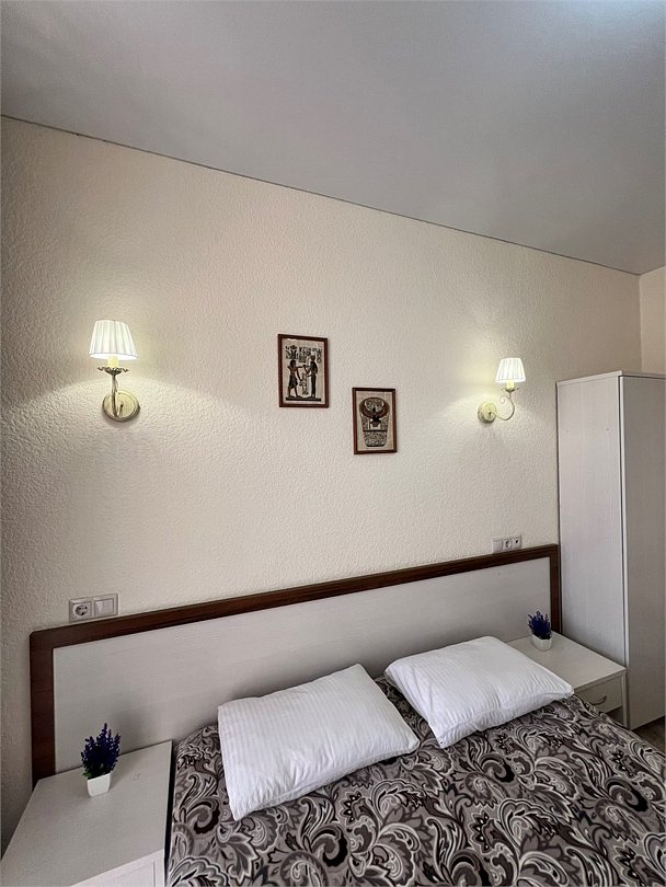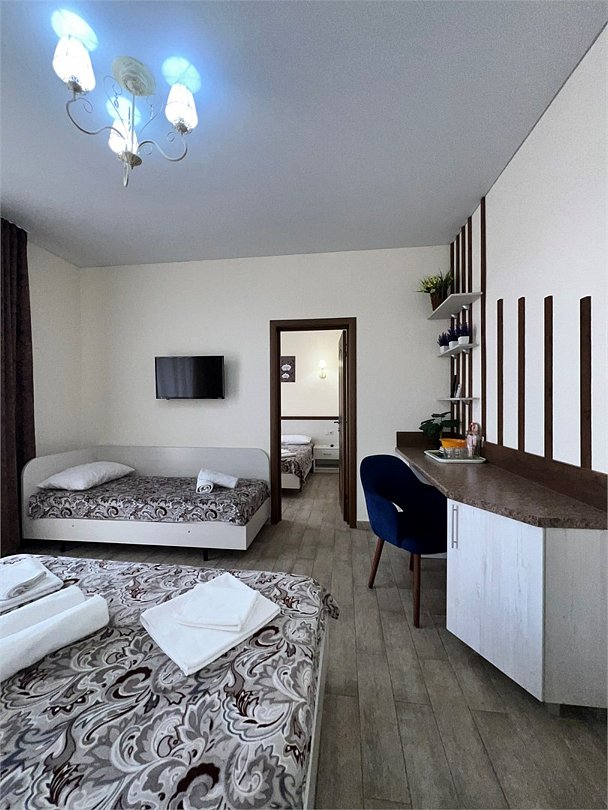 Номер площадью 22 м², размещение 4 человека. Состоит из тамбура, комнаты и санузла. Оснащен одной двуспальной кроватью и двумя односпальными кровати, холодильником, телевизором, шкафа, прикроватные тумбы, стол, стулья, различные полочки для удобства наших гостей. В тамбуре мини прихожая. Есть собственная душевая комната с санузлом, фен, полочки, ершик, мыло, полотенцаУслуги и удобства