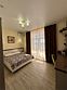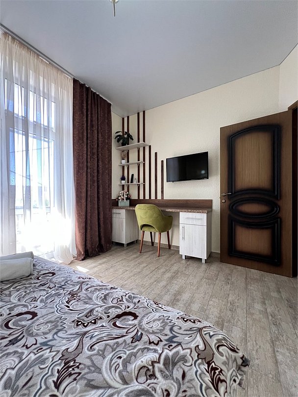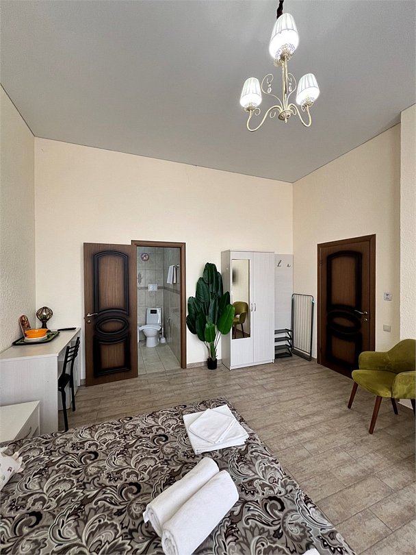 Номер площадью 40 м², размещение возможно до 5 человек. Состоит из двух комнат, оснащен двумя двуспальными кроватями а также комфортабельное кресло кровать 1м ширеной, холодильником, два телевизора, два шкафа, прикроватные тумбы, стол, стулья, различные полочки для удобства наших гостей и встроенный стол который можно использовать как туалетный столик также и для работы. В тамбуре мини прихожая и балконом с уличной мебелью. Есть собственная душевая комната с санузлом, фен, полочки, ершик, мыло, полотенца.Услуги и удобства
