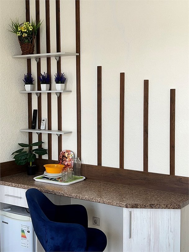 Номер площадью 37 м², размещение возможно до 5 человек. Состоит из двух комнат, оснащен двумя двуспальными кроватями и одной односпальной кроватью, холодильником, два телевизора, два шкафа, прикроватные тумбы, стол, стулья, различные полочки для удобства наших гостей и встроенный стол который можно использовать как туалетный столик также и для работы. В тамбуре мини прихожая и балконом с уличной мебелью. Есть собственная душевая комната с санузлом, фен, полочки, ершик, мыло, полотенца.Услуги и удобства
