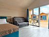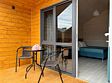 Домик оснащен: двуспальная кровать, двуспальный двиан (140х190), прикроватные тумбочки, шкаф, зеркало, вешалка, мини-холодильник, телевизор, сплит-система.