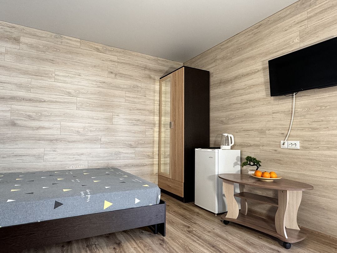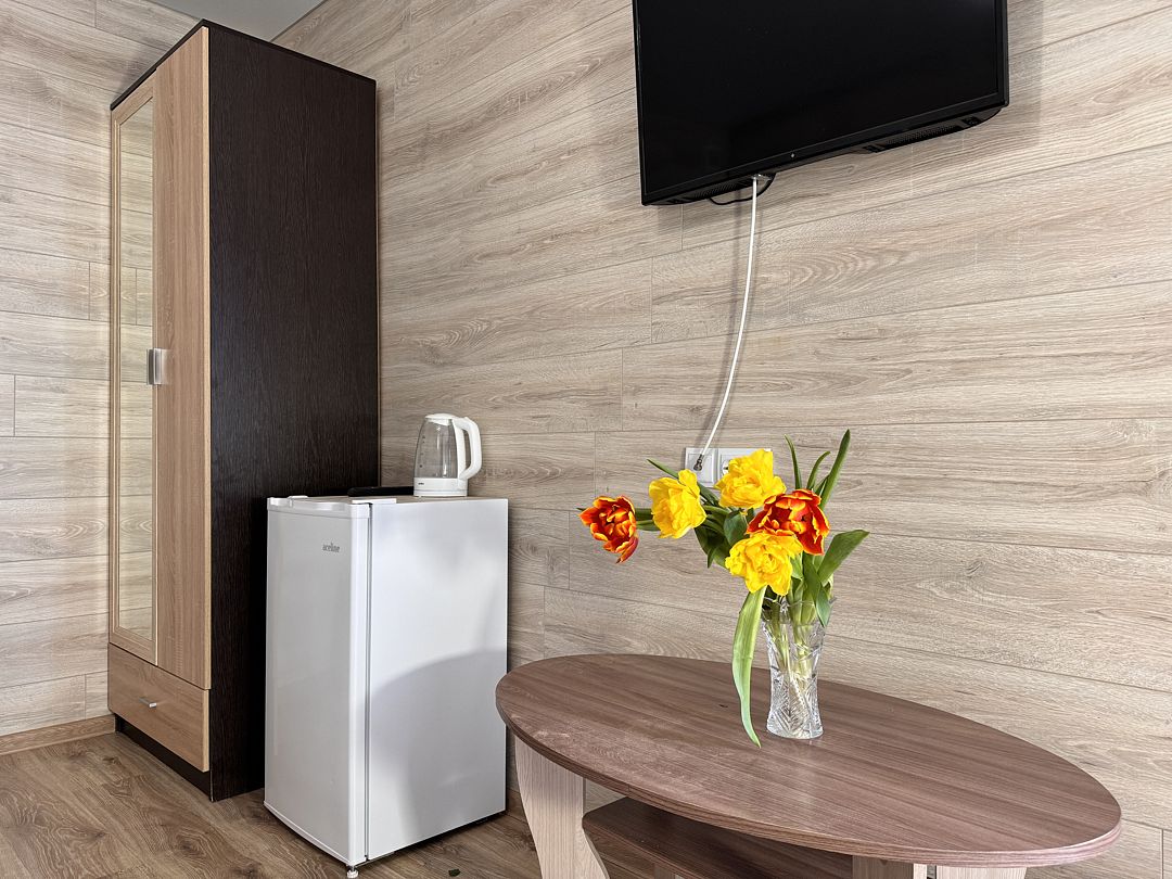 Номер оборудован: двуспальная кровать, диван-кровать, прикроватные тумбочки, зеркало, шкаф, журнальный столик, мини-холодильник, электроплитка, электрочайник, набор посуды и кухонные принадлежности, телевизор, кондиционер. Ванная комната: душ, зеркало, раковина и туалет.