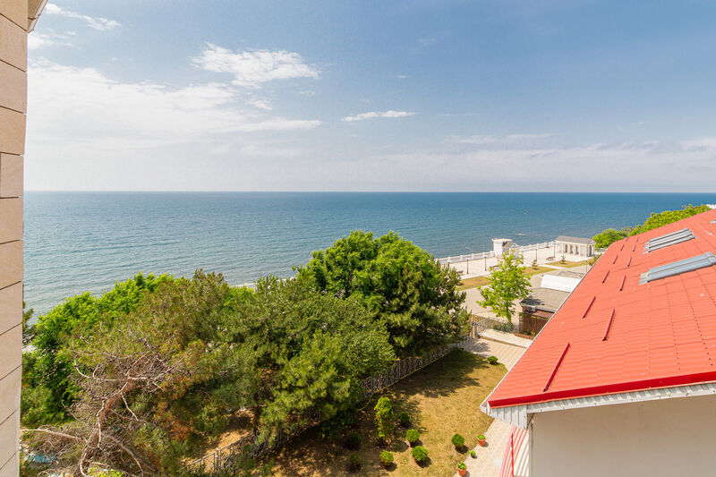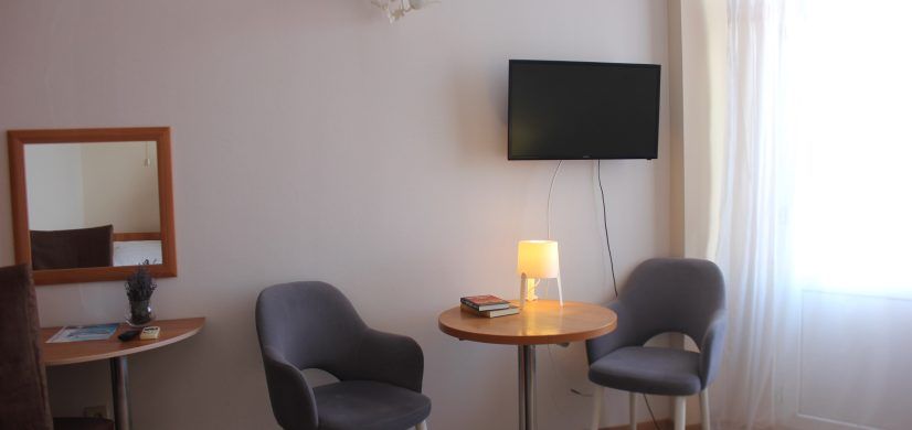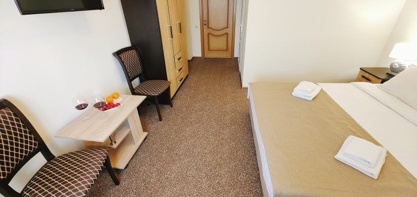 Номер оснащен: большая двуспальная кровать или две односпальные кровати, прикроватные тумбочки, журнальный столик, шкаф, зеркало, вешалка, ТВ, мини-холодильник, сплит-система. В номере имеется небольшой балкончик, с которого видно море.