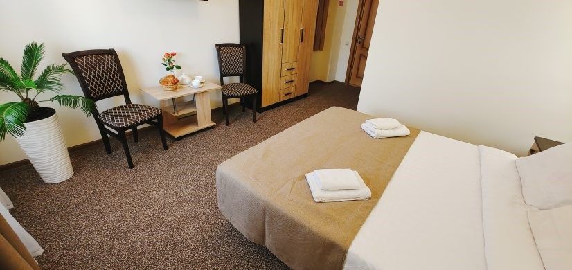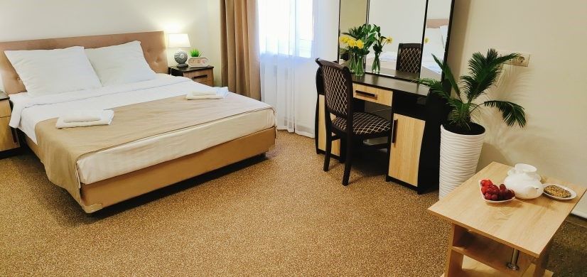 Номер оснащен: большая двуспальная кровать или две односпальные кровати, прикроватные тумбочки, журнальный столик, шкаф, зеркало, вешалка, ТВ, мини-холодильник, сплит-система.
