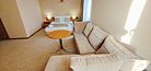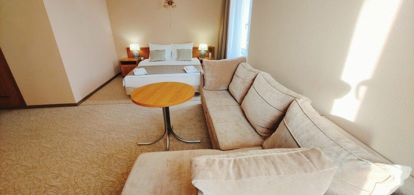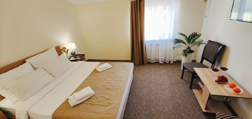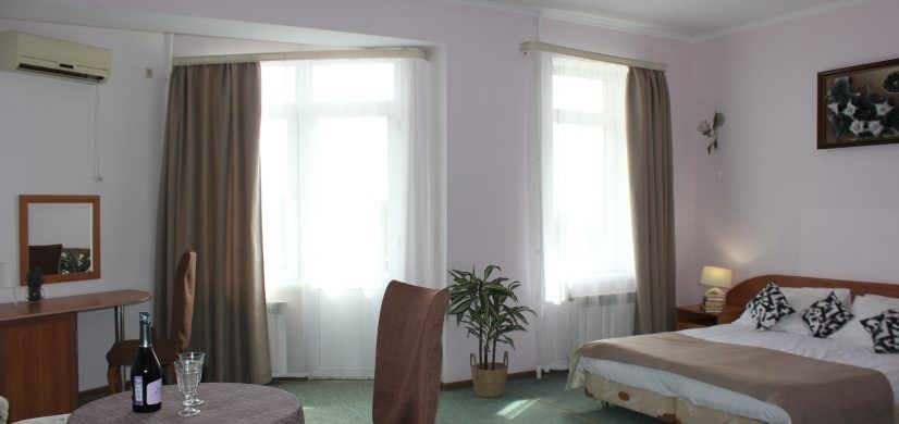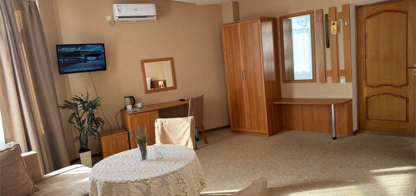 Номер оснащен: большая двуспальная кровать, угловой двухместный диван, прикроватные тумбочки, журнальный столик, шкаф, зеркало, вешалка, ТВ, мини-холодильник, сплит-система.