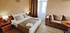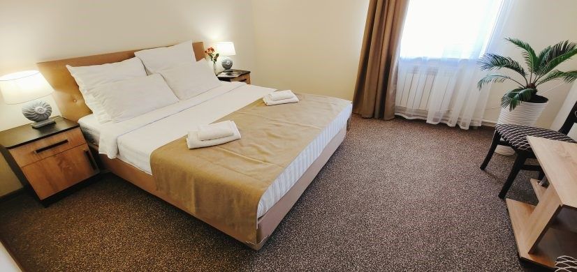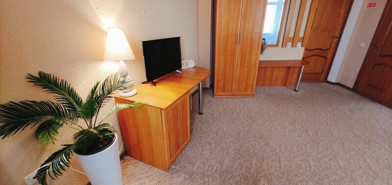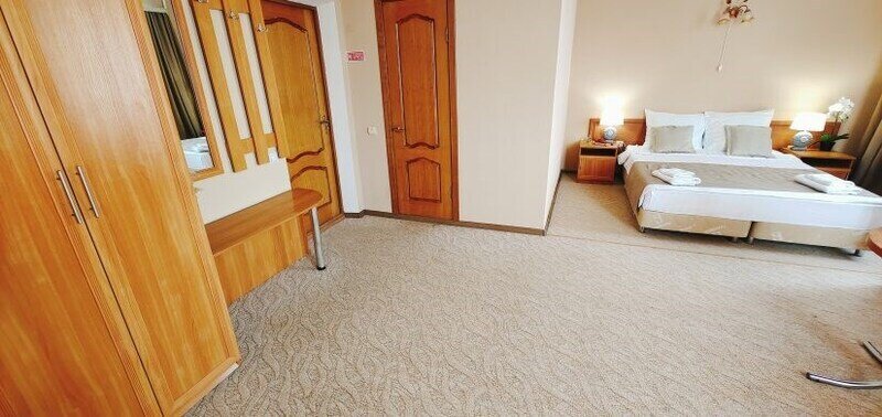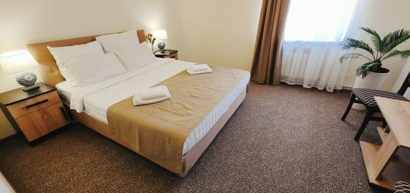 Номер оснащен: большая двуспальная кровать, прикроватные тумбочки, журнальный столик, шкаф, зеркало, вешалка, ТВ, мини-холодильник, сплит-система