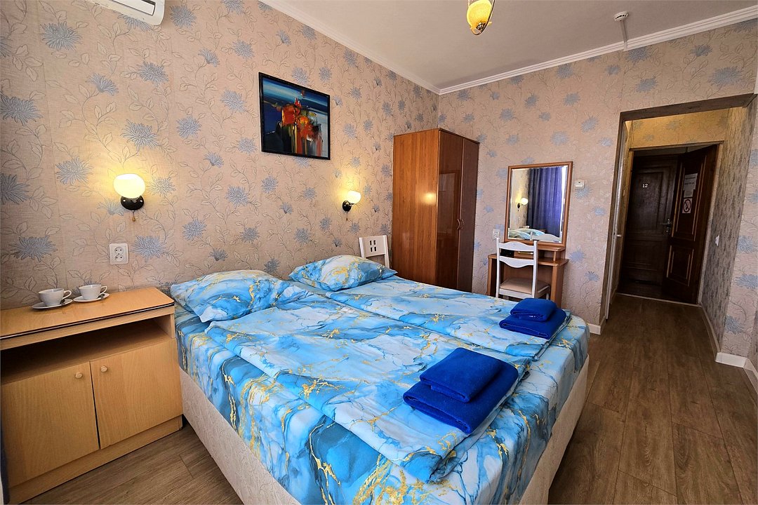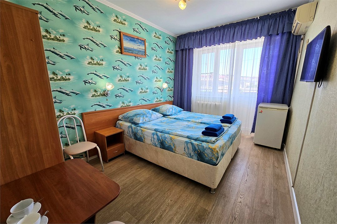 телевизор, Wi-Fi, холодильник, кондиционер, светильник, душевая кабина, гигиенические средства, две односпальные или большая двуспальная кровать, шкаф для одежды, вешалки, мебельный гарнитур, отопление, кулер на этаже, ламинат, туалет, сушилка для белья, москитная сетка, номер для некурящих, без питомцевВ гостиничном номере