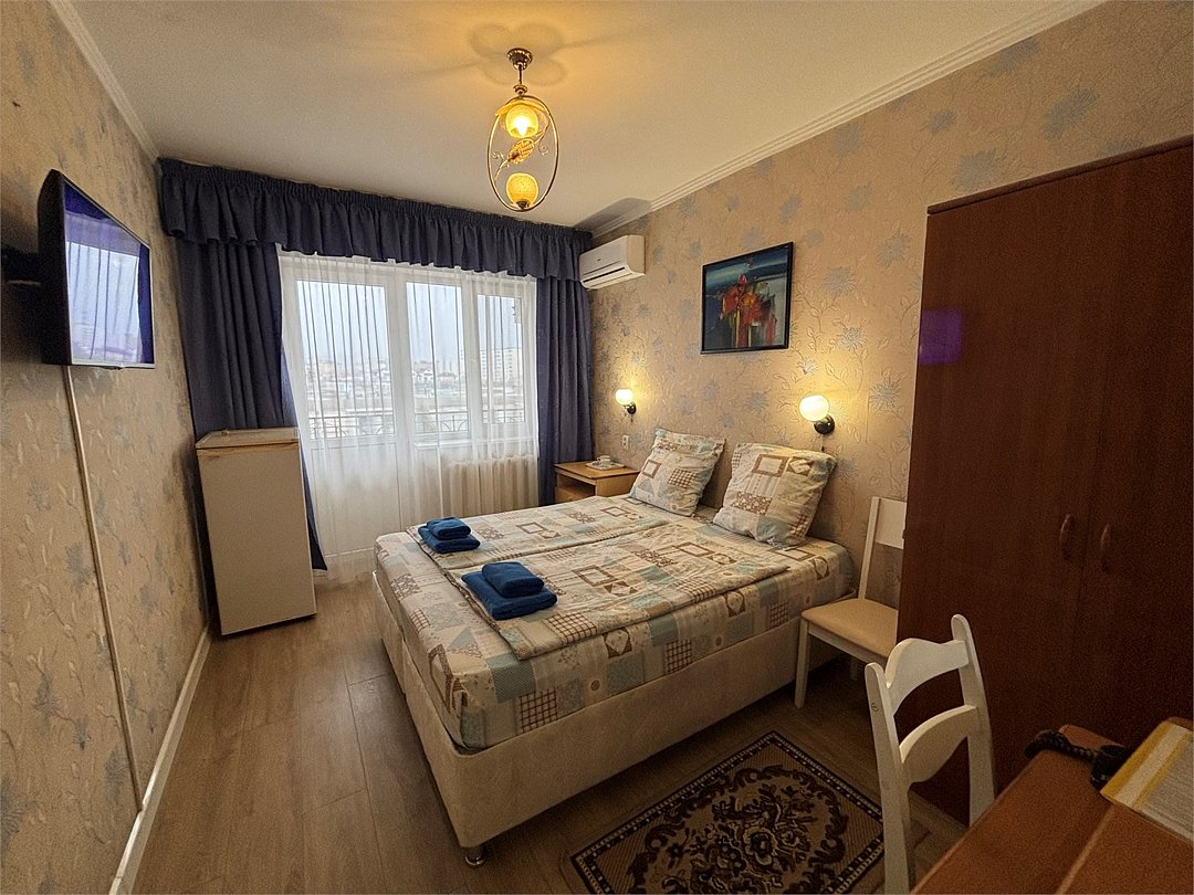 телевизор, Wi-Fi, холодильник, кондиционер, душевая кабина, санузел, гигиенические средства, балкон, две односпальные или большая двуспальная кровать, стулья, шкаф для одежды, вешалки, зеркало, унитаз, раковина, отопление, кулер на этаже, туалетный столик, туалетные средства, сушилка для белья, москитная сетка, номер для некурящих, без питомцевВ гостиничном номере