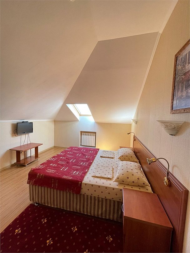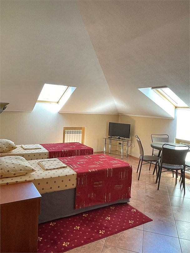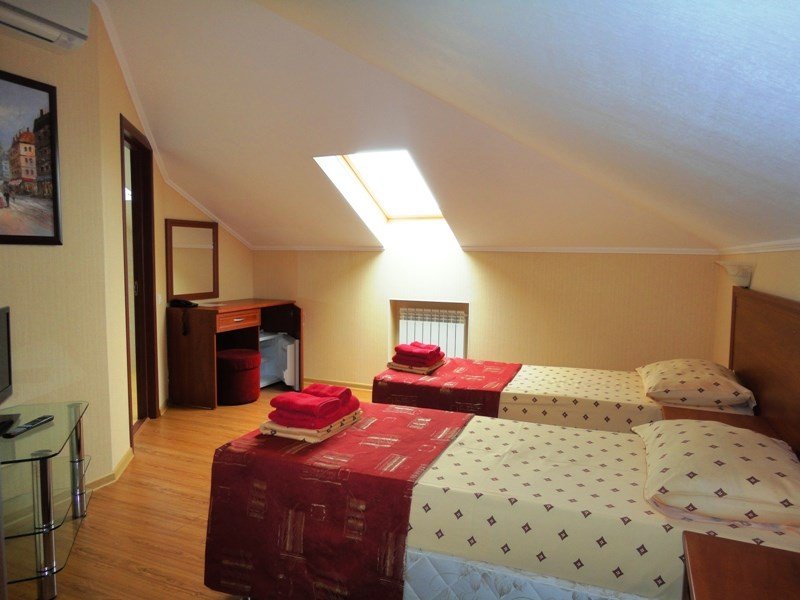 Уютный семейный мансардный 2-х комнатный номер с МИНИ Кухней с окнами в потолке. Все номера оборудованы электронными ключами, установлены датчики дыма и новейшая пожарная сигнализация. Смена белья и полотенец производится на 4 день проживания. На 4-ом этаже, в начале коридора находятся гладильная доска, утюг, кулер с горячей и холодной водой. Размещение номеров на 5 этаже. На лифте можно доехать до 4-го этажа, далее подняться на этаж выше пешком.Услуги и удобства