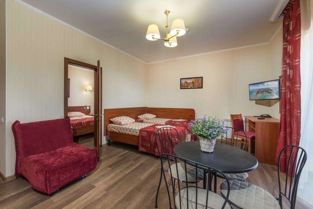 Wi-Fi, холодильник, кондиционер, светильник, фен, электронные замки, кофемашина, микроволновая печь, банные полотенца, косметические средства, балкон с красивым видом, двуспальная кровать, две односпальные кровати, тумбы, стулья, шкаф для одежды, вешалки, обеденный стол, зеркало, две комнаты, набор посуды, сейф, чайник, унитаз, раковина, душ, кулер на этаже, кухонная посуда, стаканы, кухонная утварь, столовые приборы, туалетные средства, туалет, цифровое тв, раскладное кресло, внутренний телефон, телевизор с плоским экраном, мини-кухня, рабочий стол, гигиенический душ, кресло-кровать, можно с питомцамиВ гостиничном номере