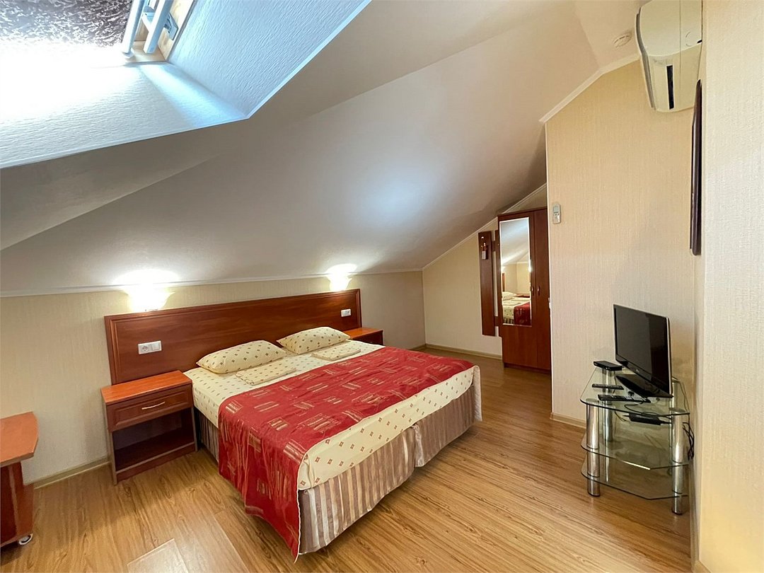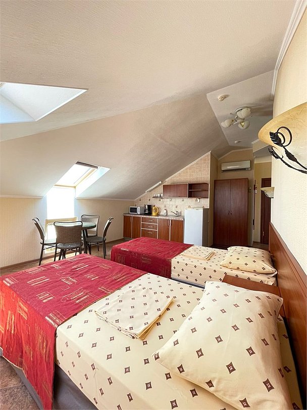 Wi-Fi, холодильник, кондиционер, фен, электронные замки, кофемашина, микроволновая печь, банные полотенца, косметические средства, двуспальная кровать, две односпальные кровати, тумбы, стулья, шкаф для одежды, вешалки, обеденный стол, зеркало, две комнаты, набор посуды, сейф, чайник, унитаз, душ, кухонная посуда, кухонная утварь, туалетные средства, туалет, цифровое тв, раскладное кресло, внутренний телефон, телевизор с плоским экраном, мини-кухня, мансардные окна, рабочий стол, гигиенический душ, кресло-кровать, можно с питомцамиВ гостиничном номере