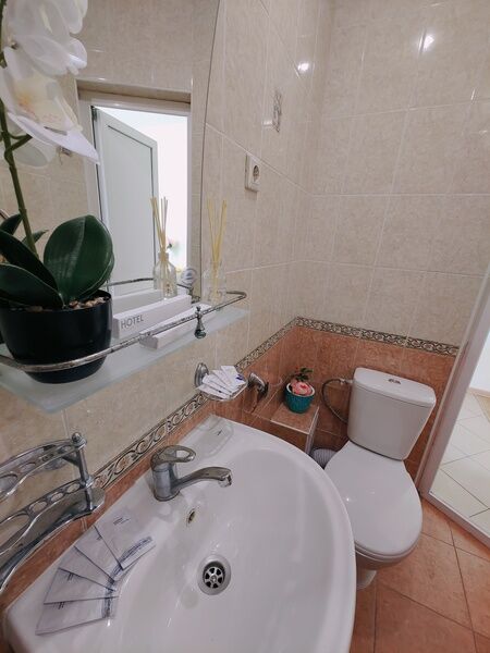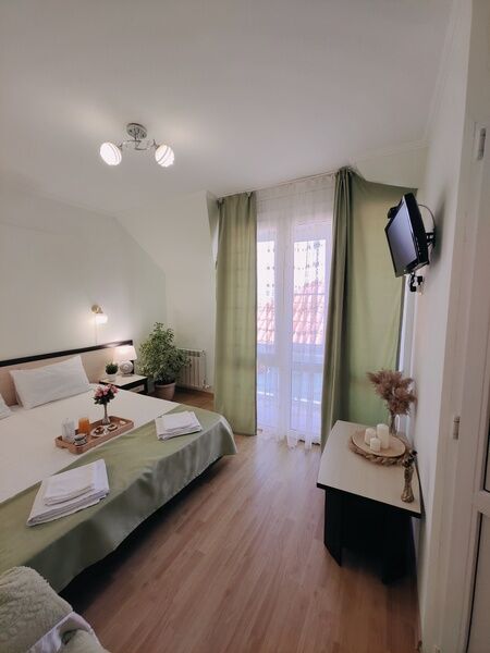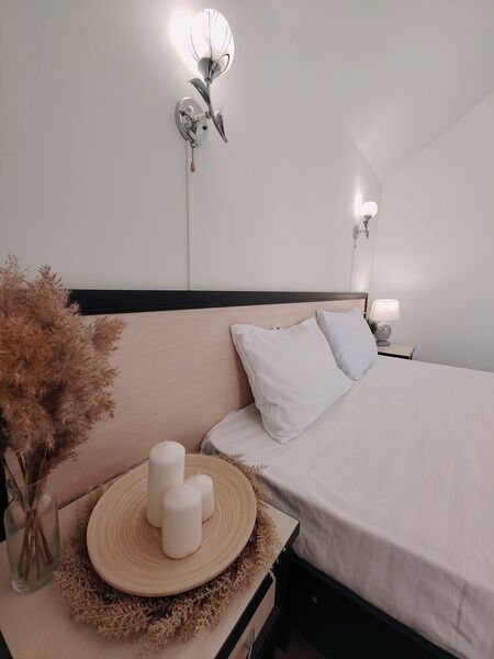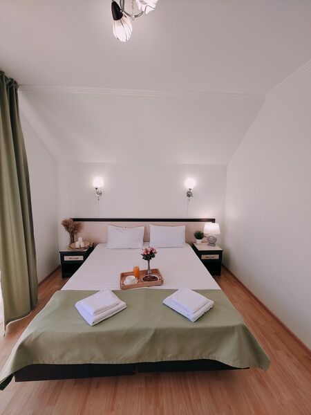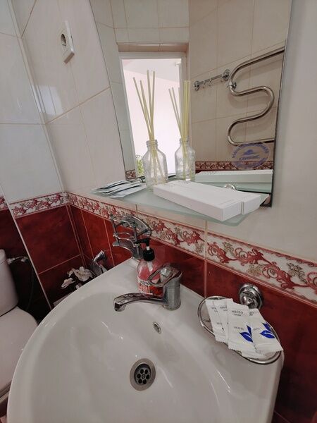 - Здание 4 этажа (без лифта), с разным номерным фондом. Есть большие двухкомнатные номера на 5-х человек. Мы взяли двухкомнатный номер. Номер нам понравился, он довольно уютный. В номере чисто и комфортно. Есть один минус, матрасы на кроватях пружинные, не очень комфортно спать.