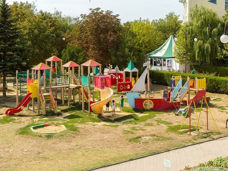 На территории есть открытый бассейн, инфракрасная сауна, теннисный корт и много других активных развлечений. Для маленьких гостей работают аниматоры, можно арендовать стульчики, прогулочные коляски и велосипеды.