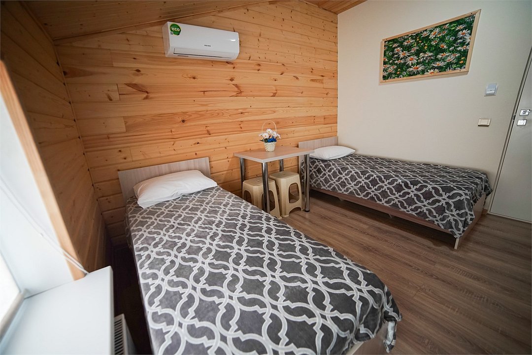 Wi-Fi, холодильник, санузел, две полутораспальные кровати, шкаф для одежды, унитаз, раковина, душ, вид во двор, ламинат, стаканы, тумба, туалет, сплит-система, телевизор с плоским экраном, москитная сетка, номер для некурящихВ номере