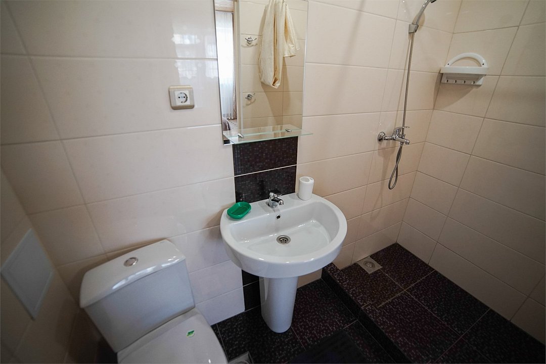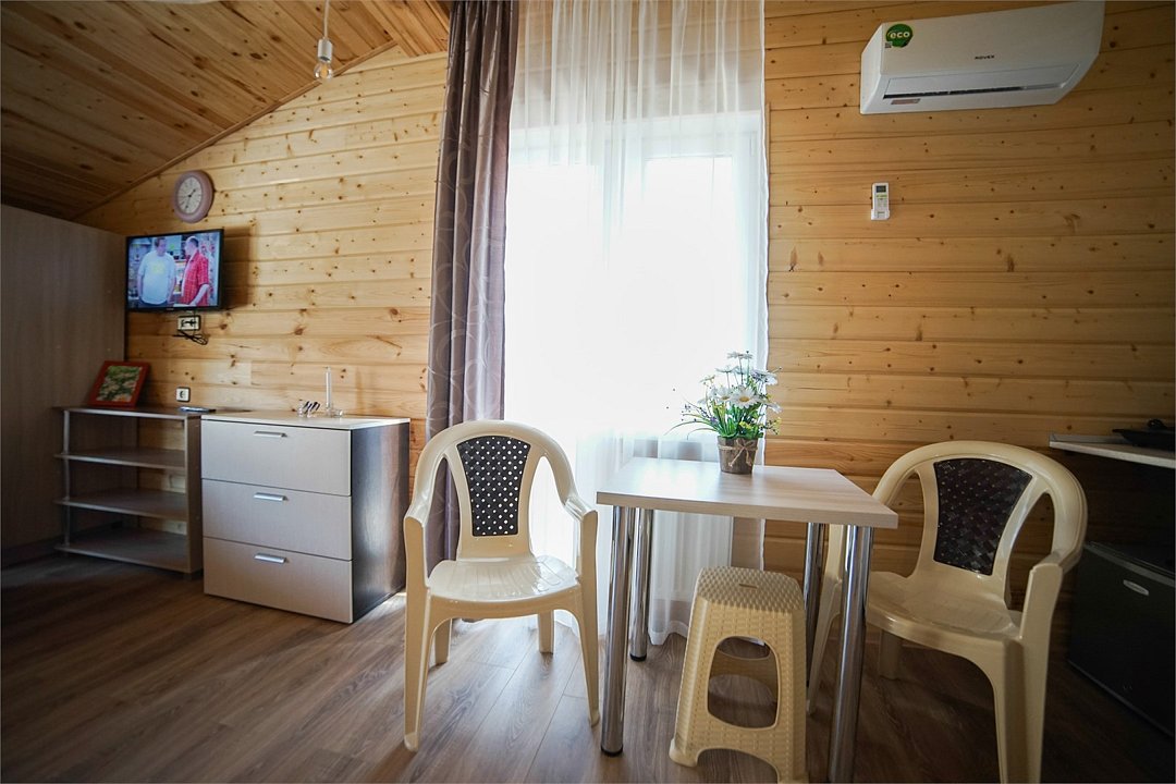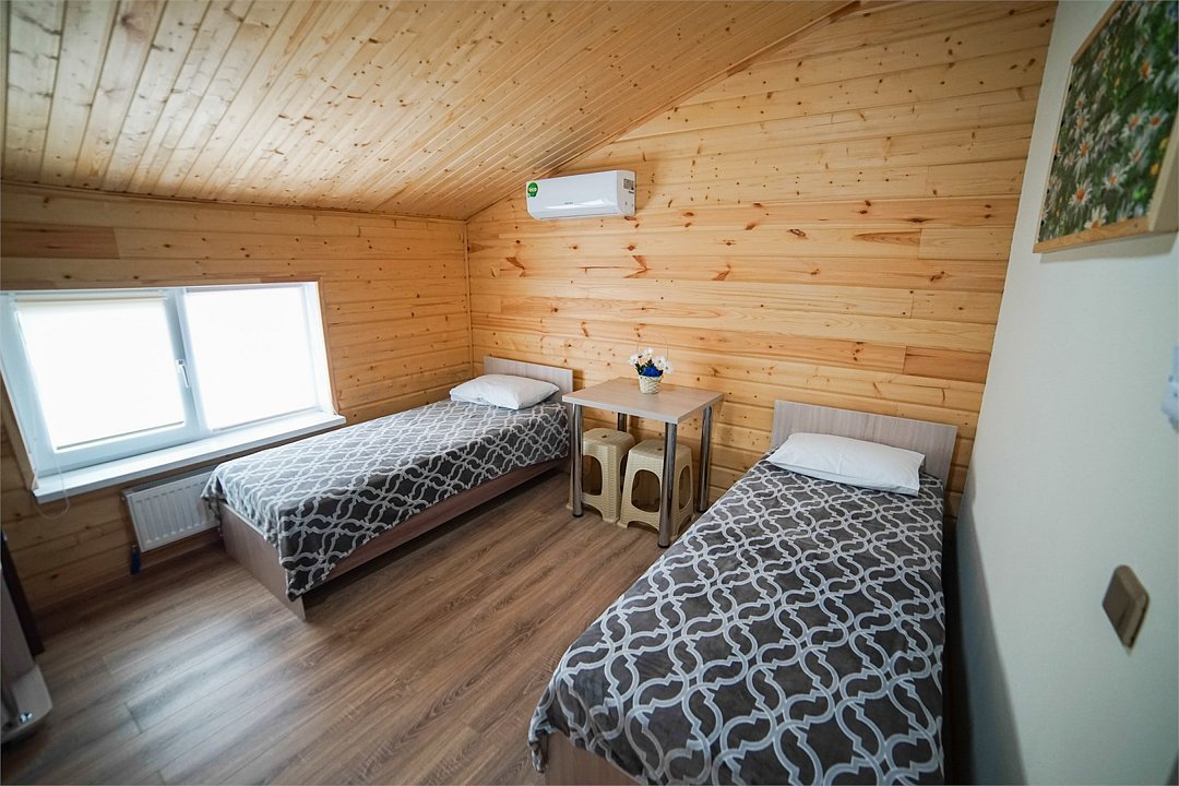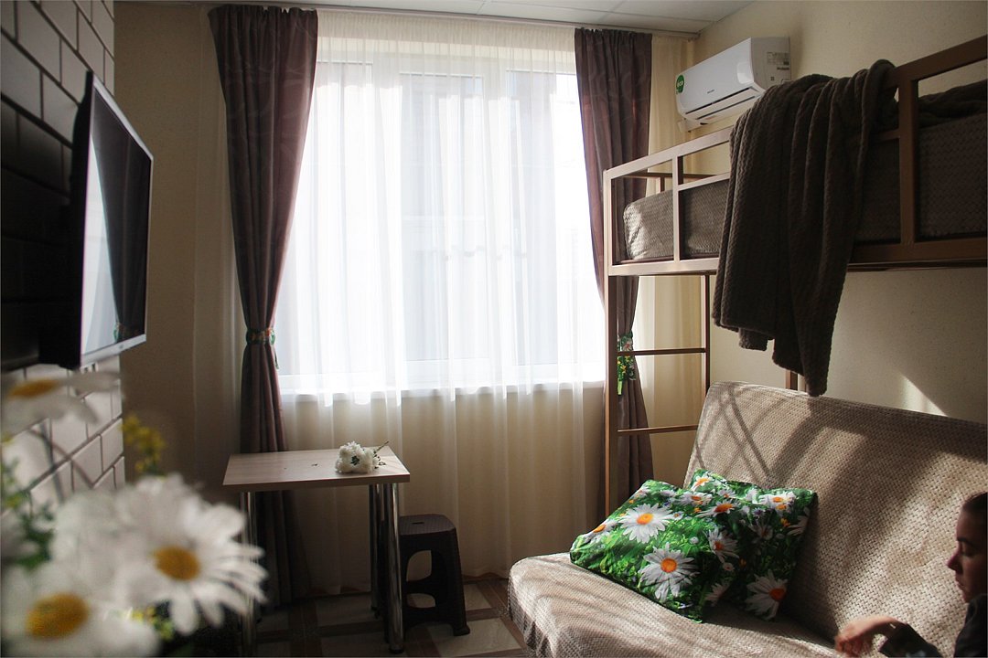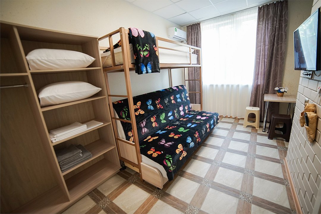 Wi-Fi, санузел, двуспальная кровать, полутораспальная кровать, шкаф для одежды, вешалки, обеденный стол, чайник, унитаз, раковина, двухъярусные кровати, отопление, душ, кулер на этаже, вид во двор, стаканы, стул, сплит-система, раскладной диван, телевизор с плоским экраном, мини-холодильник, москитная сетка, теплые полыВ номере