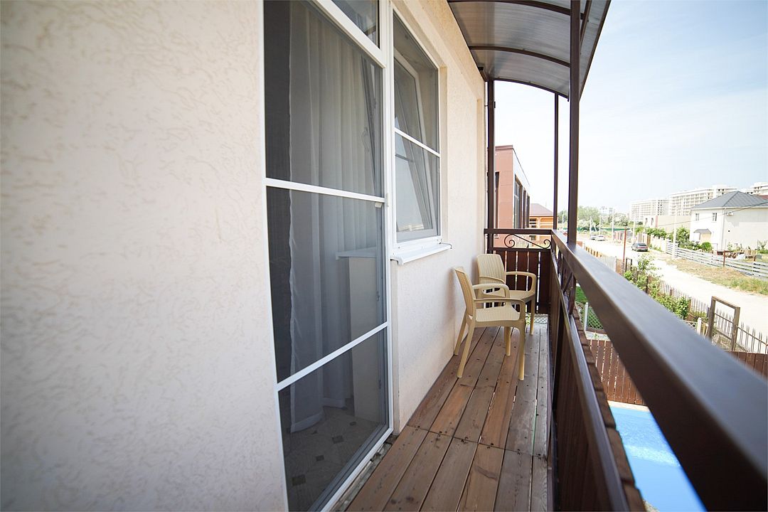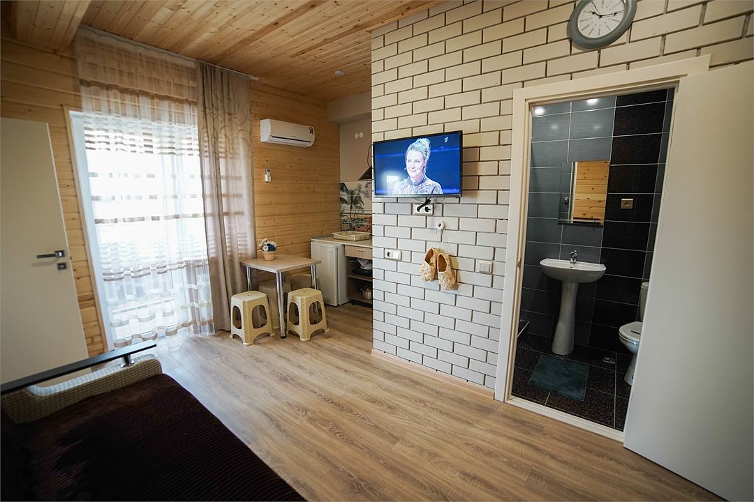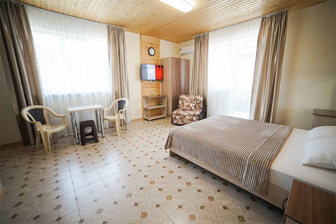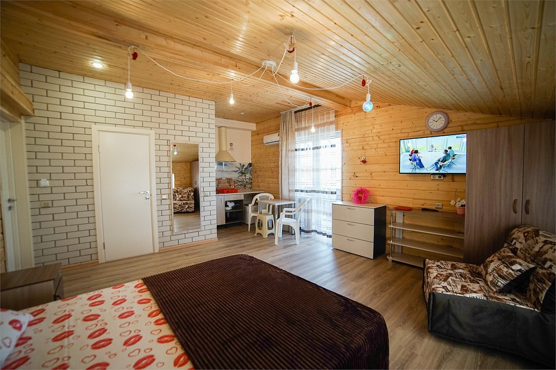 Просторный номер-студия с балконом с видом на бассейн. В номере есть холодильник, возможность размещения на одной двуспальной кровати или двух кроватях 80*200 и детской 80*160Услуги и удобства