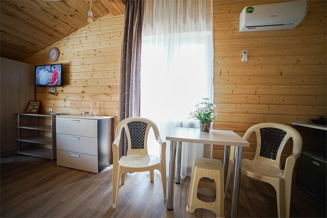Wi-Fi, холодильник, кондиционер, фен, электронные замки, плита для приготовления пищи, микроволновая печь, банные полотенца, терраса, двуспальная кровать, стулья, шкаф для одежды, вешалки, обеденный стол, зеркало, набор посуды, чайник, унитаз, раковина, отдельный вход в номер, душ, вид во двор, стаканы, столовые приборы, диван-кровать, телевизор с плоским экраном, москитная сеткаВ гостиничном номере