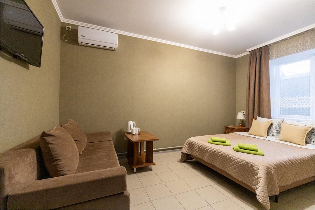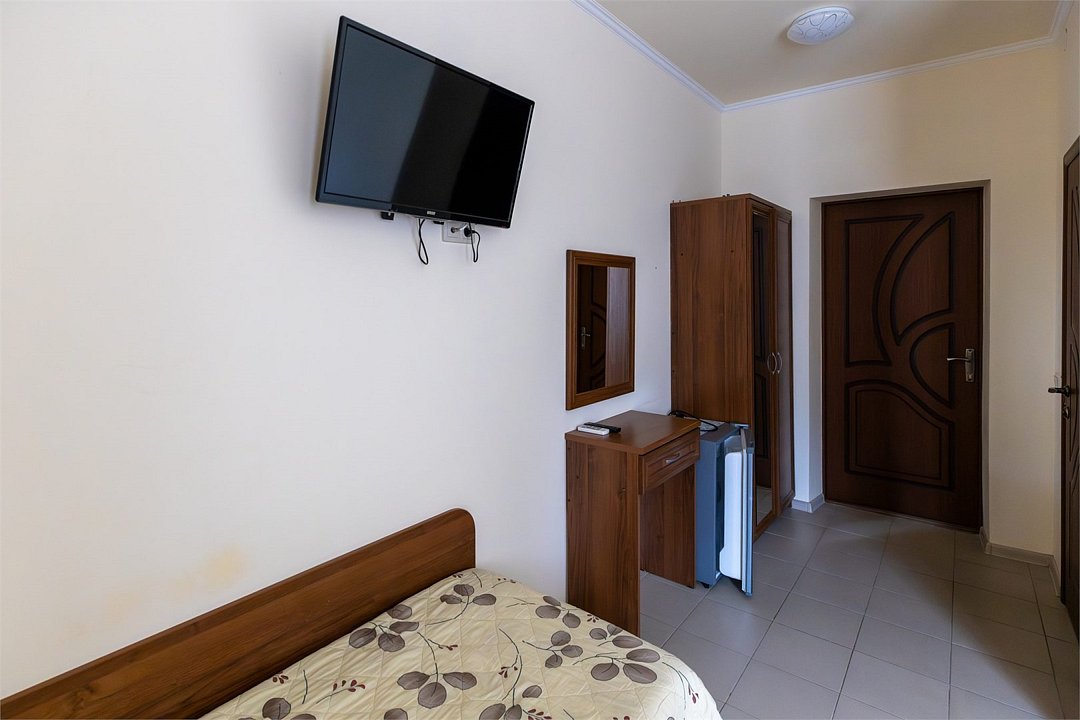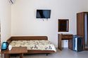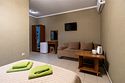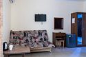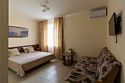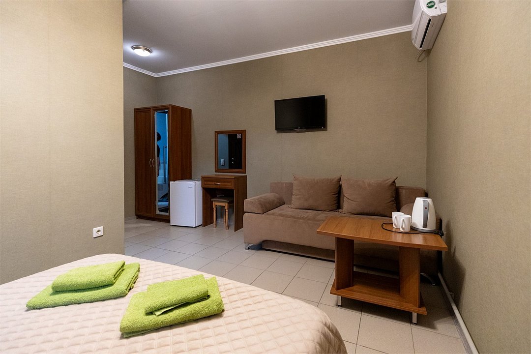 Если вы хотите отдохнуть в Сукко с комфортом и не везти с собой полдома, номер «Делюкс» — то, что надо. В нём есть всё для комфортного отдыха: холодильник, чайник и чайная пара, фен, телевизор. В «Делюксе» большая двуспальная кровать, на которую так приятно прилечь после насыщенного дня. Если гостей больше, чем двое — не проблема. В номере есть диван, который раскладывается, так что ещё двое могут разместиться. Условия подходят для длительного отдыха, командировок и отдыха даже с самыми маленькими детьми. Есть отдельный санузел, сплит и отопление, которое можно включить, если станет холодно. Свежий евроремонт, вся необходимая мебель, бытовая техника — мы постарались сделать номер «Делюкс» по-домашнему удобным, чтобы вы могли расслабиться и насладиться отдыхом.Услуги и удобства