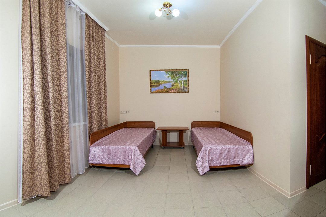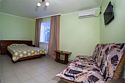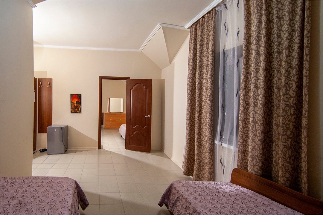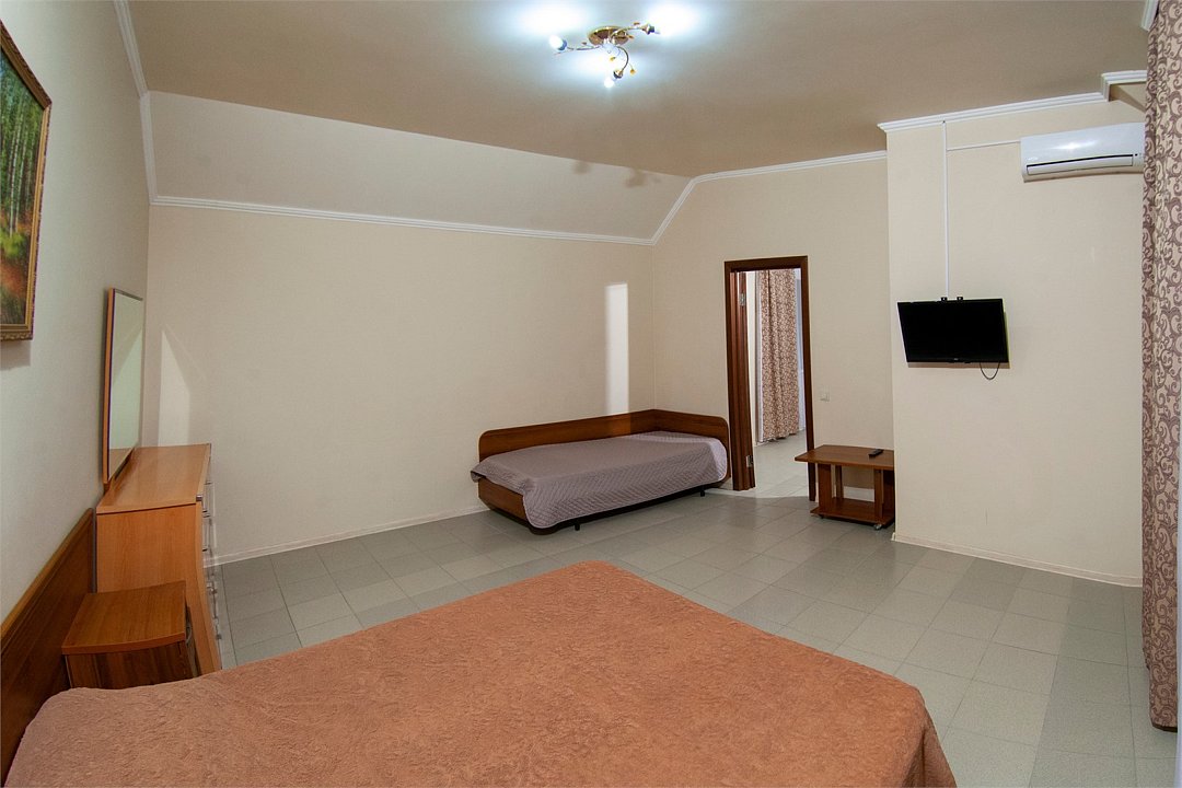 Номер «Семейный» в Сукко — удобный и экономичный вариант для размещения семьёй или большой компанией. В номере две комнаты, вместимость номера — до пяти человек. Вы можете выбрать вариант с отдельными кроватями или сочетанием дивана и кресла-кровати. Во второй комнате по умолчанию стоит большая двуспальная кровать. У каждого номера свой санузел, в комнатах установлены сплит-системы, чтобы проживание в них было комфортным. Также для удобства гостей в номере есть холодильник, ЖК телевизор и вся необходимая мебель. Все номера очень уютные, светлые.Услуги и удобства