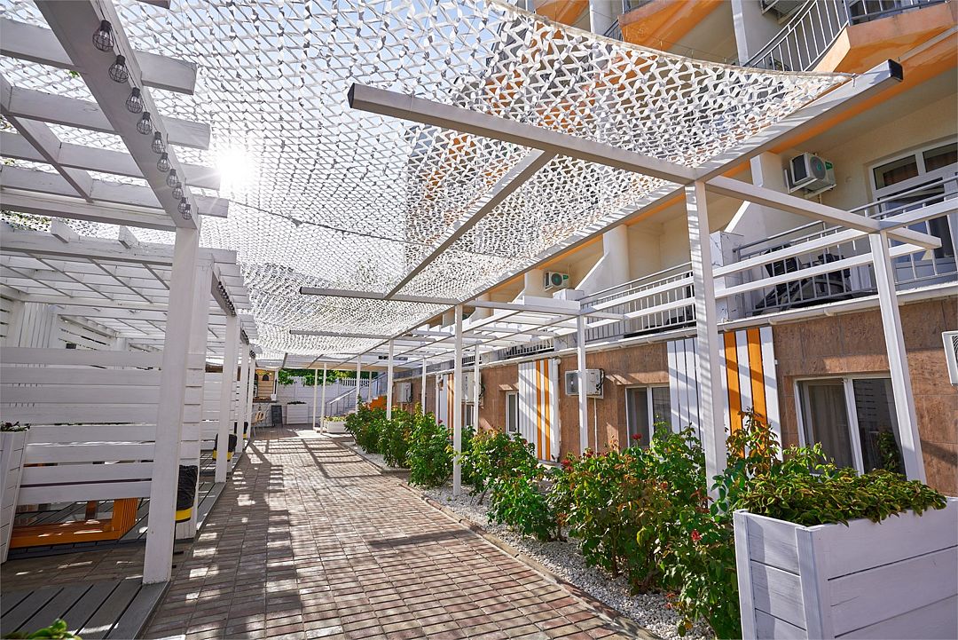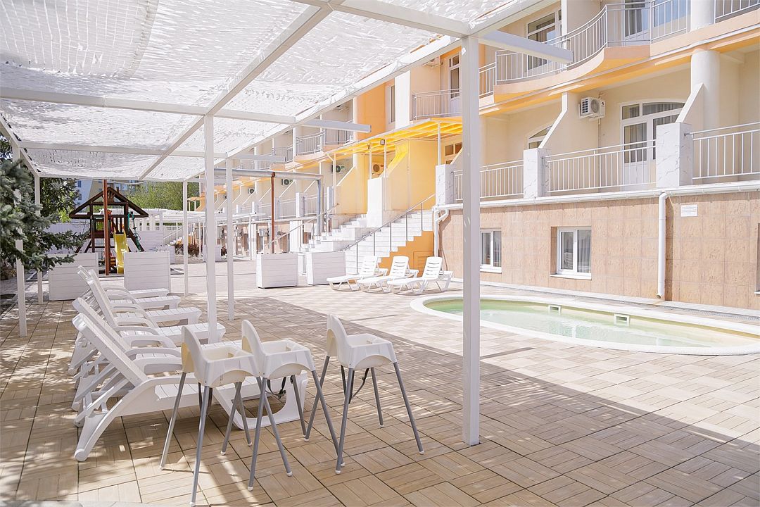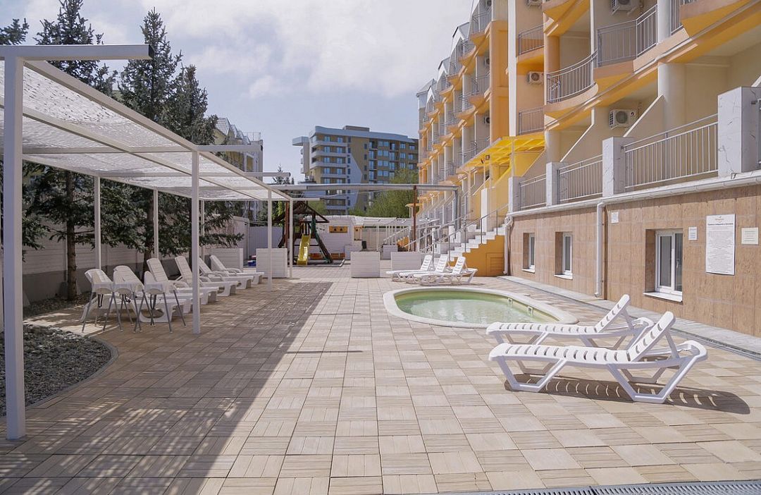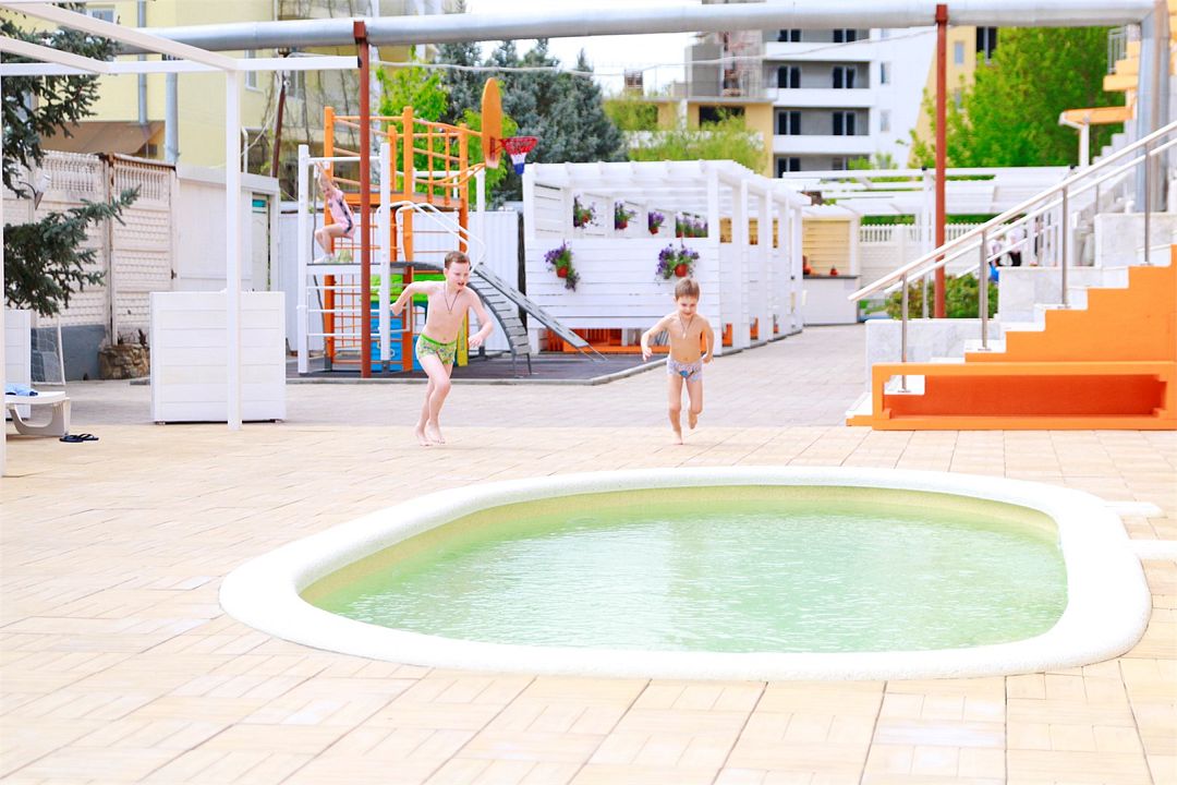 К услугам гостей уютная зона отдыха на территории отеля, включающая две чаши бассейнов: взрослого и детского с подогревом, место под шезлонги с перголой, детская игровая площадка, детская комната с профессиональными воспитателями, компьютерный зал и бесплатный Wi-Fi во всех номерах, а также уютные скамейки, беседки и качели. Свежая зелень и аромат цветов создадут прохладу даже в самый жаркий день и позволят расслабиться.
