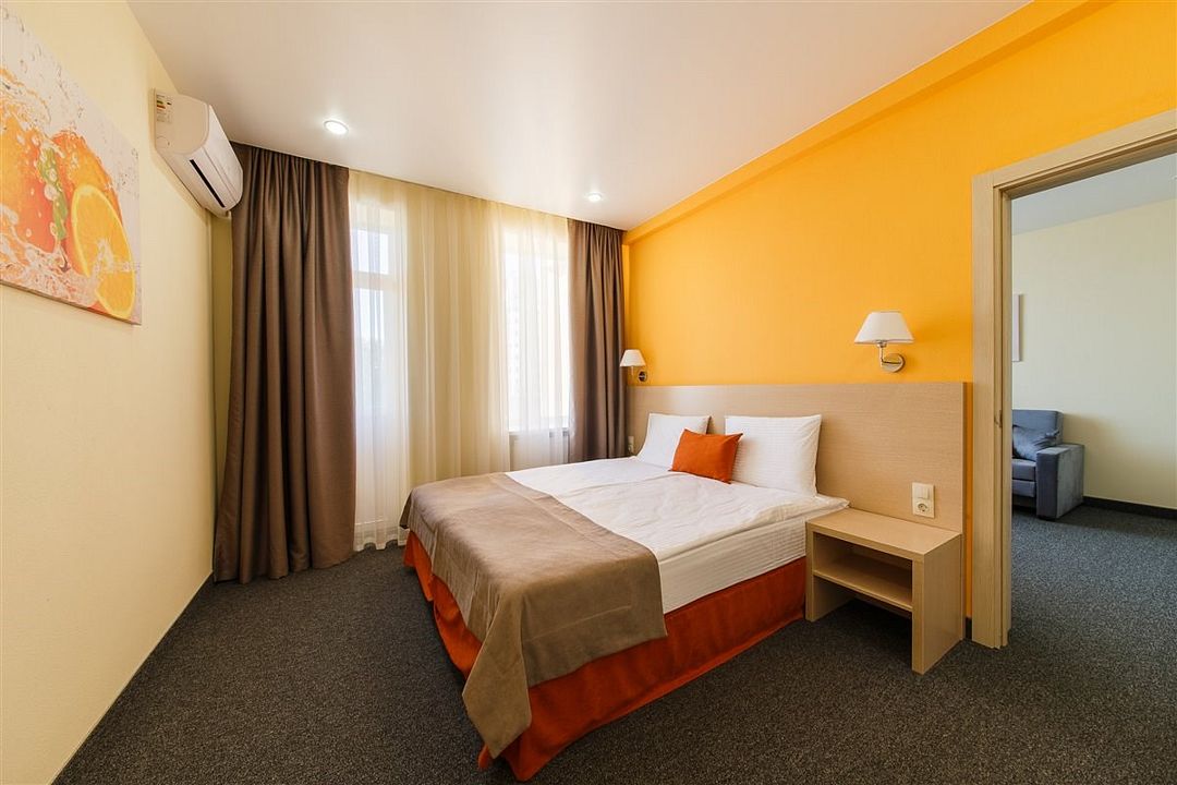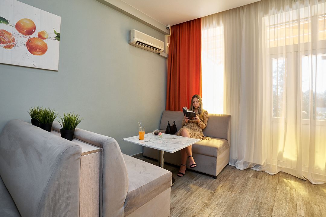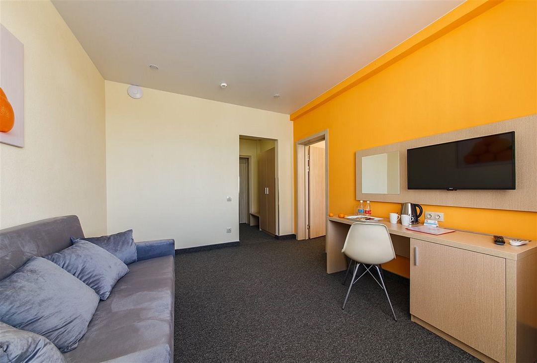 Двухкомнатный номер «Семейный» станет отличным выбором для недорогого отдыха на море всей семьёй! Двухкомнатный просторный номер категории люкс площадью 35 м2, состоящий из двух комнат- гостиной комнаты и спальни. Во всех номерах: рабочая зона индивидуальное кондиционирование, LED ТВ-панель со спутниковыми каналами, холодильник, бесплатный доступ в интернет (Wi-Fi/LAN), телефон, сейф, чайная станция, индивидуальная косметика, халат, тапки. Для Вашего комфорта в номерах выделены гардеробная зона, ванная комната и балкон.Услуги и удобства