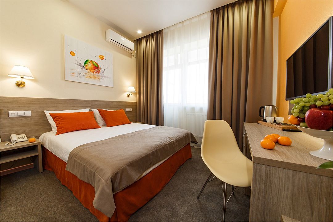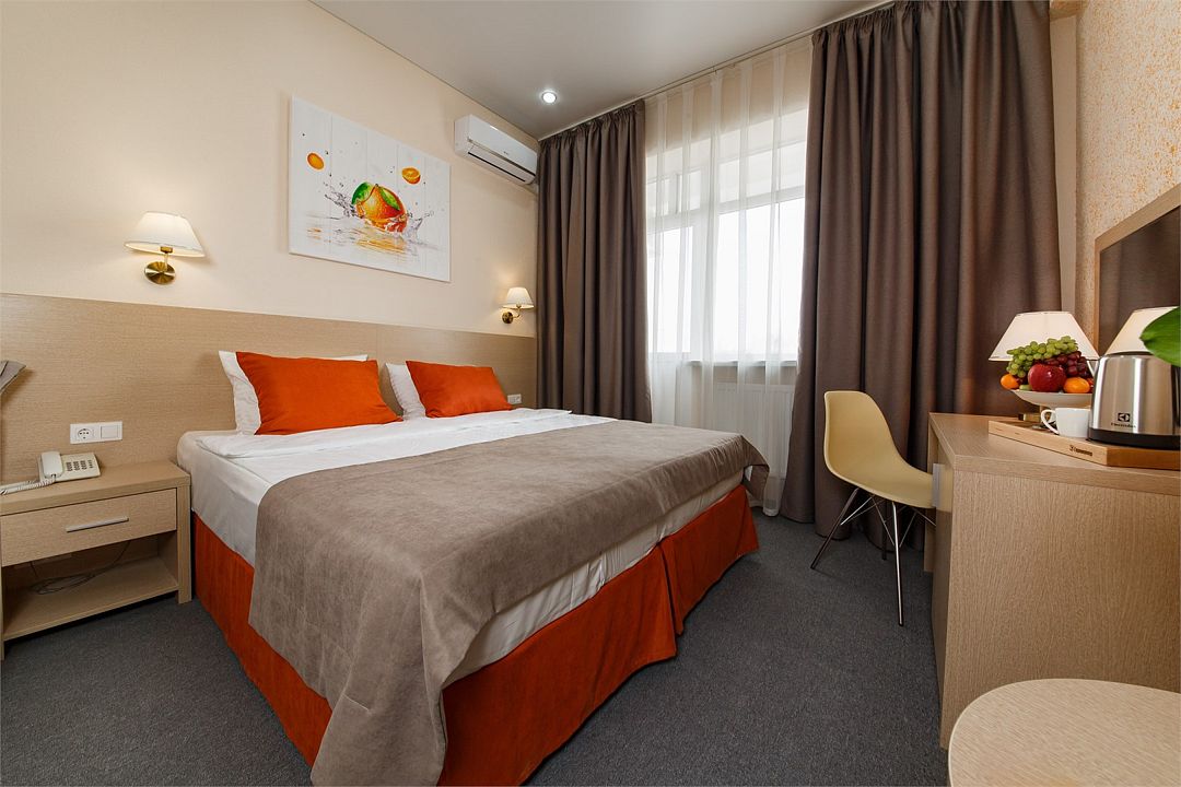 Категория «Стандарт с одной двуспальной кроватью» – это однокомнатный номер, площадью 19 м2, с душем, односпальной кроватью king size 180*200 см. Возможно размещение до 3 человек. Во всех номерах: рабочая зона, индивидуальное кондиционирование, LED ТВ-панель со спутниковыми каналами, холодильник, бесплатный доступ в интернет (Wi-Fi/LAN), телефон, сейф, чайная станция. Для Вашего комфорта в номерах выделены гардеробная зона, ванная комната и балкон.Услуги и удобства