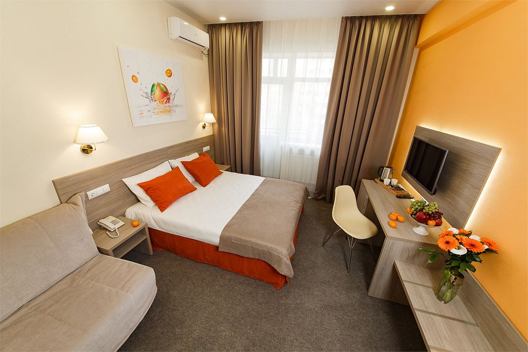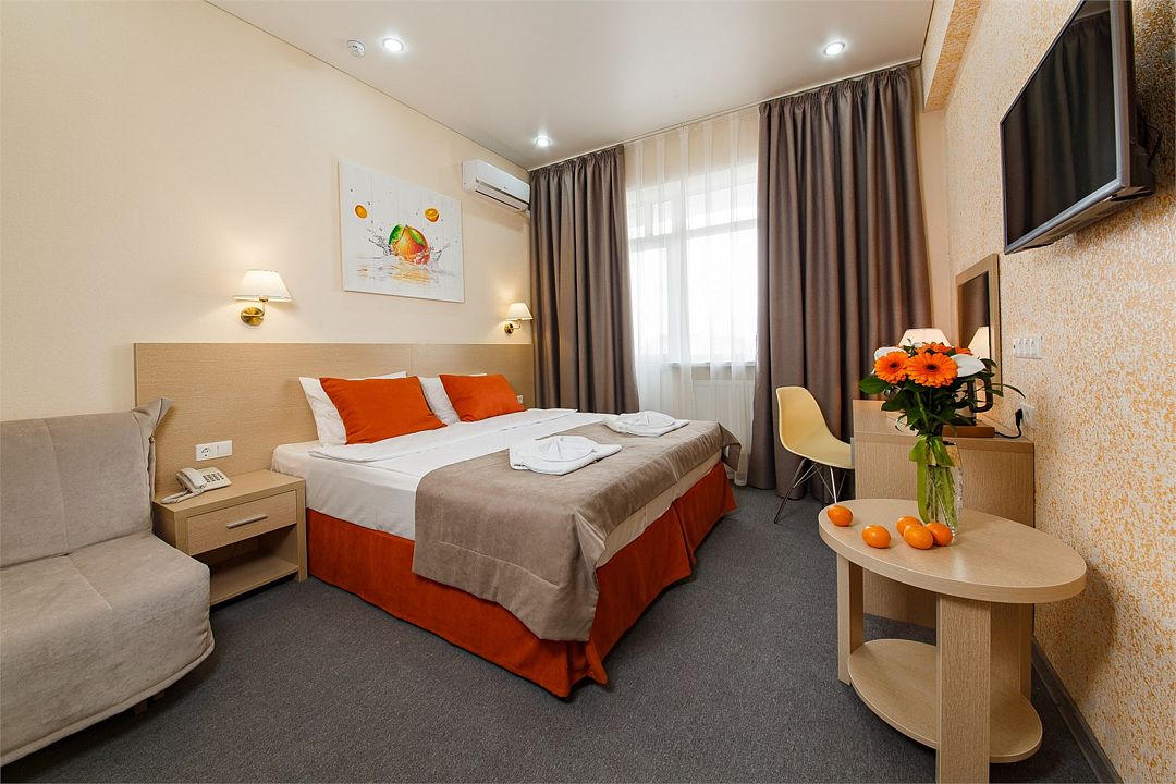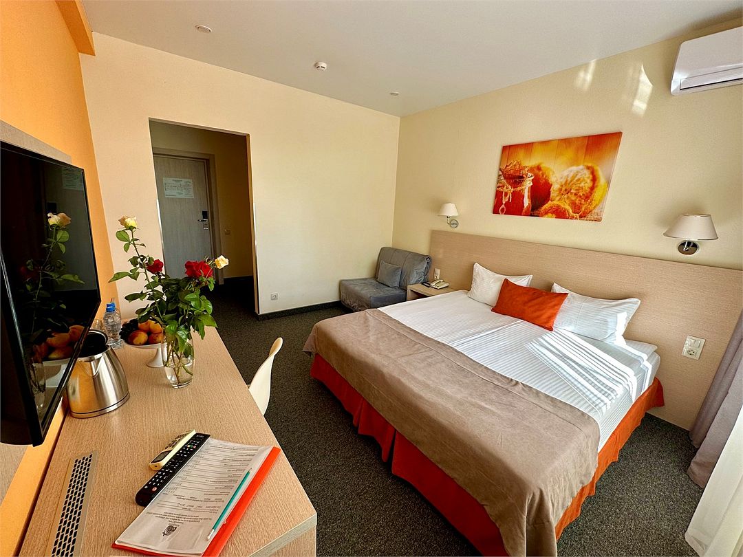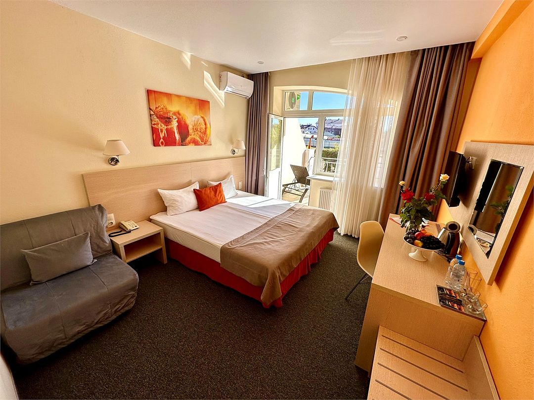 Категория «Комфорт» – это однокомнатный комфортный номер площадью 19 м2, с одной большой кроватью king size 180*200 см или двумя раздельными кроватями Во всех номерах имеется индивидуальное кондиционирование, LED ТВ-панель со спутниковыми каналами, холодильник, бесплатный доступ в интернет (Wi-Fi/LAN), телефон, сейф., чайная станция. Для Вашего комфорта в номерах выделены гардеробная зона, ванная комната. Просторные балконы с лежаками позволяют принимать солнечные ванны прямо не выходя из номера, а также индивидуальная косметика, халаты, тапки и рум-сервис включены в стоимость номера.Услуги и удобства