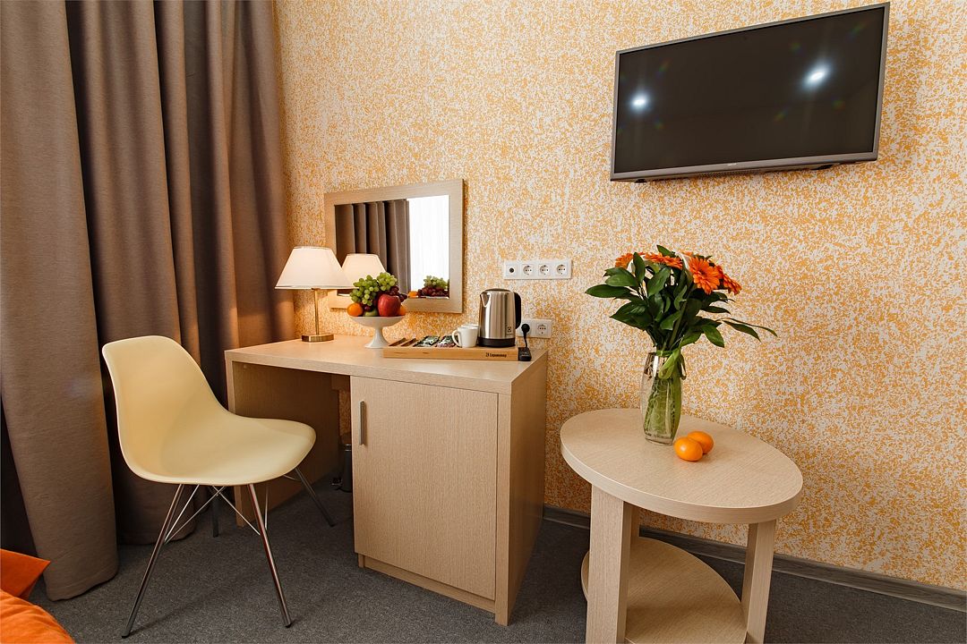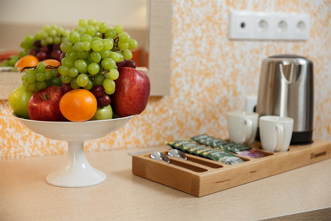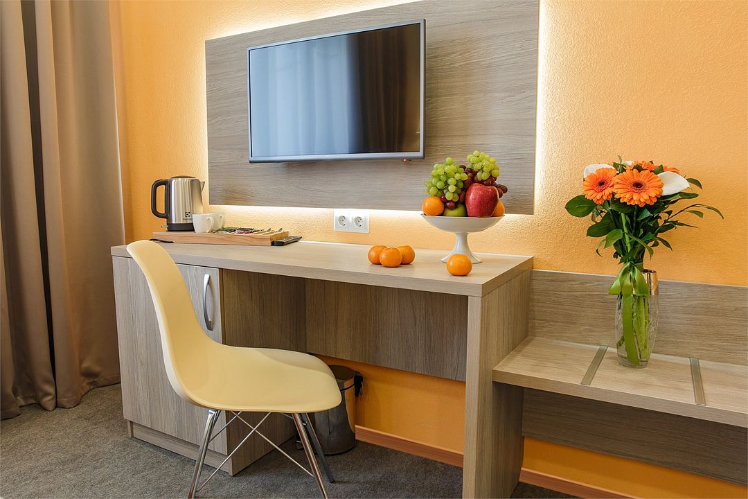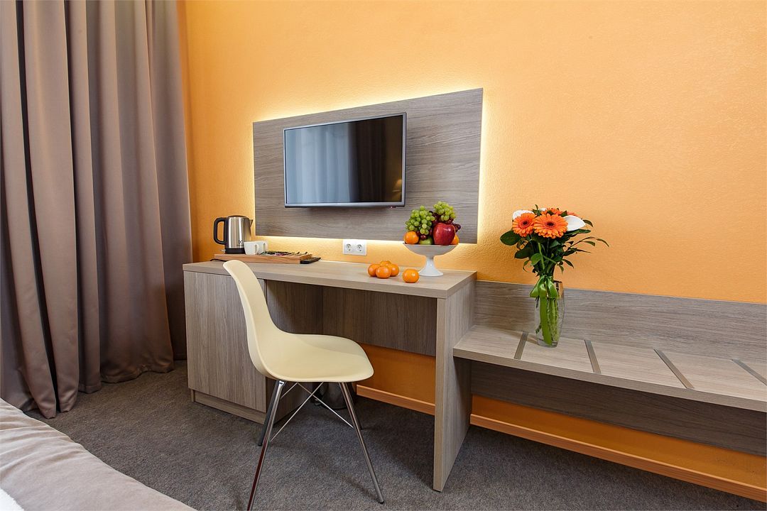 Категория «Комфорт» – это однокомнатный комфортный номер площадью 19 м2, с одной большой кроватью king size 180*200 см или двумя раздельными кроватями Во всех номерах имеется индивидуальное кондиционирование, LED ТВ-панель со спутниковыми каналами, холодильник, бесплатный доступ в интернет (Wi-Fi/LAN), телефон, сейф., чайная станция. Для Вашего комфорта в номерах выделены гардеробная зона, ванная комната. Просторные балконы с лежаками позволяют принимать солнечные ванны прямо не выходя из номера, а также индивидуальная косметика, халаты, тапки и рум-сервис включены в стоимость номера.Услуги и удобства