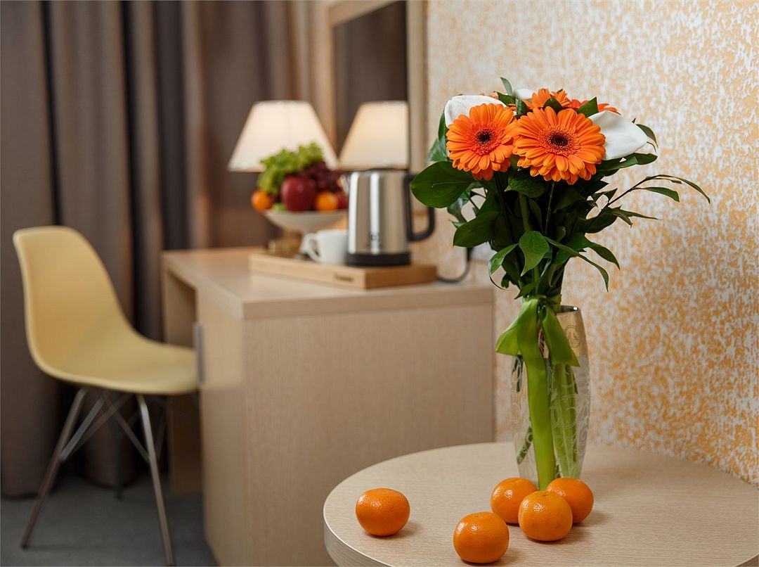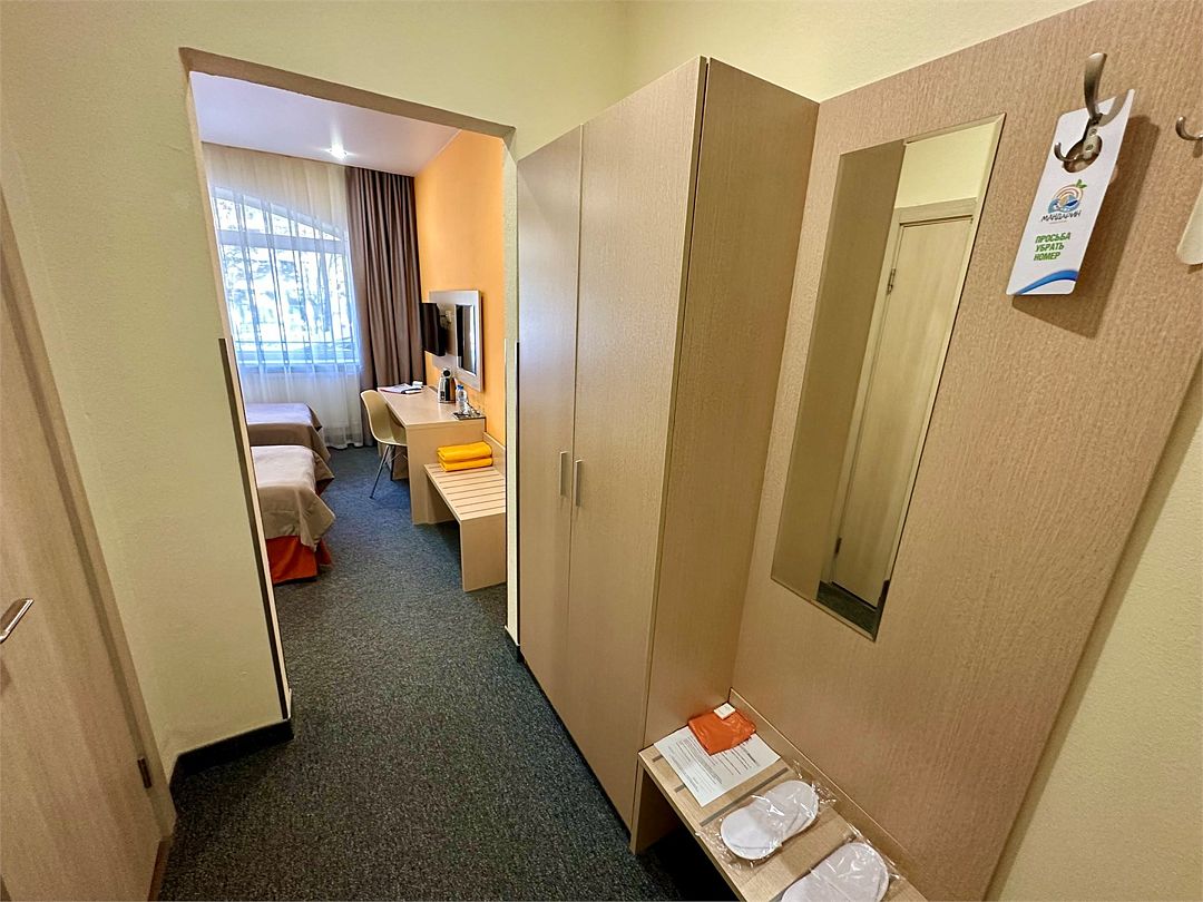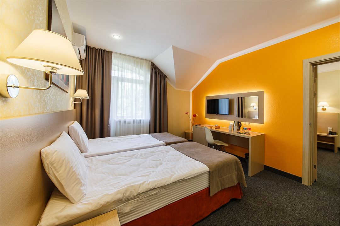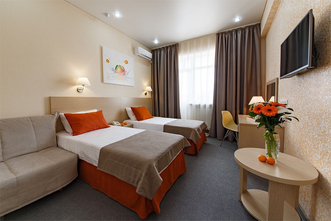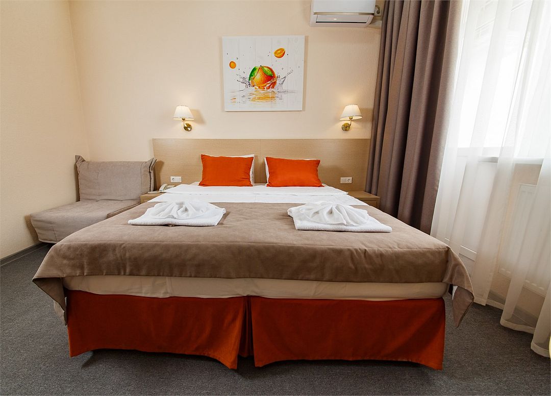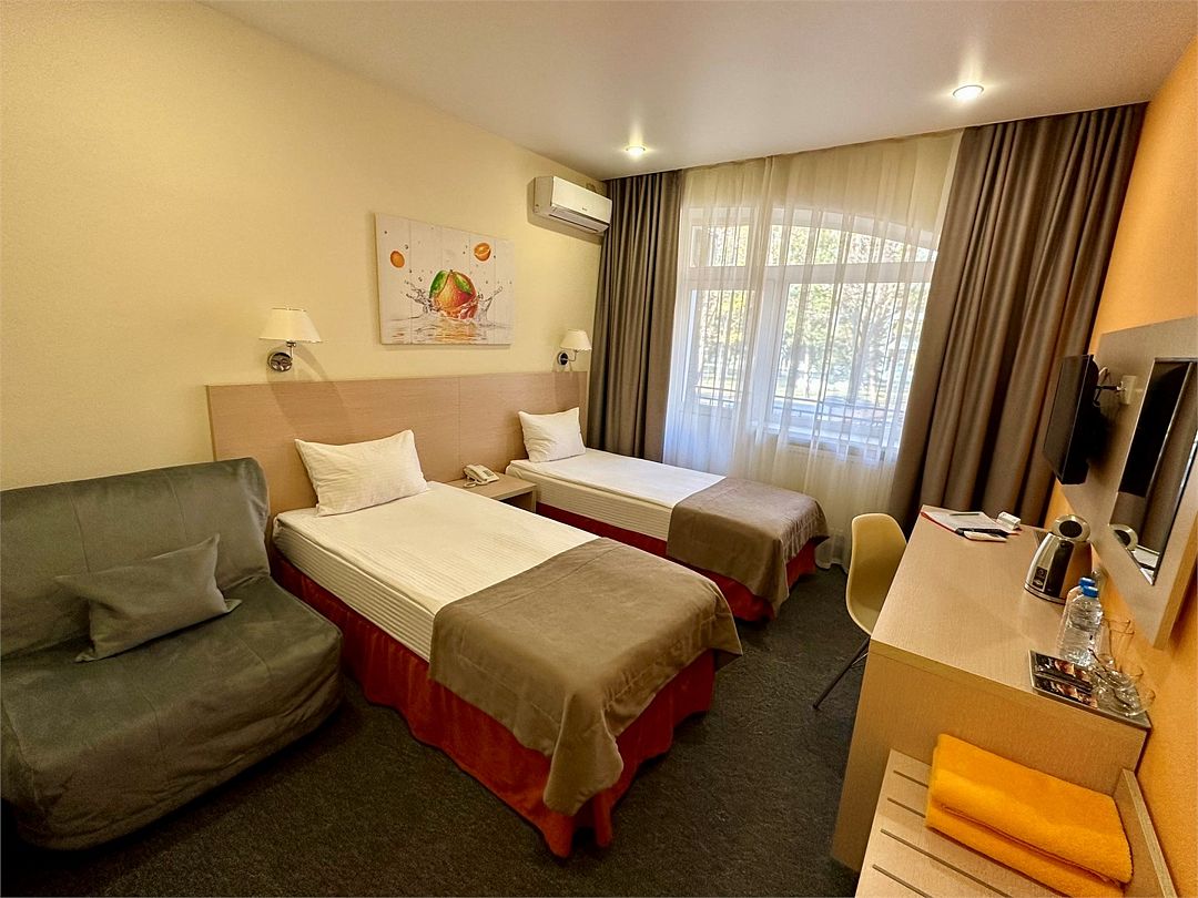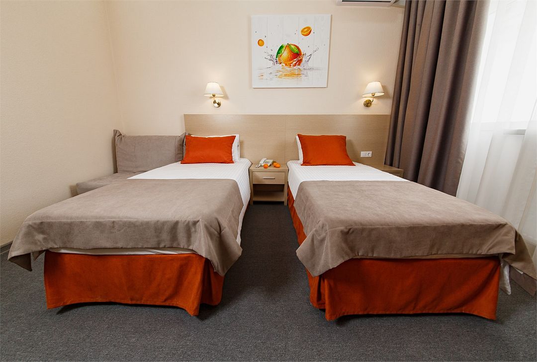 Категория «Стандарт с двумя раздельными кроватями» – это однокомнатный номера площадью 19 м2, с душем, двуспальной кроватью 90*200 см каждая. Возможно размещение до 3 человек. Во всех номерах: рабочая зона, индивидуальное кондиционирование, LED ТВ-панель со спутниковыми каналами, холодильник, бесплатный доступ в интернет (Wi-Fi/LAN), телефон, сейф., чайная станция. Для Вашего комфорта в номерах выделены гардеробная зона, ванная комната и балкон.Услуги и удобства