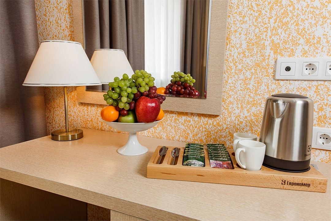 телевизор, Wi-Fi, телефон, холодильник, кондиционер, фен, душевая кабина, банные полотенца, косметические средства, балкон, терраса, двуспальная кровать, две односпальные кровати, тумбы, шкаф для одежды, письменный стол, зеркало, чайник, унитаз, стул, раскладное кресло, без питомцевВ гостиничном номере