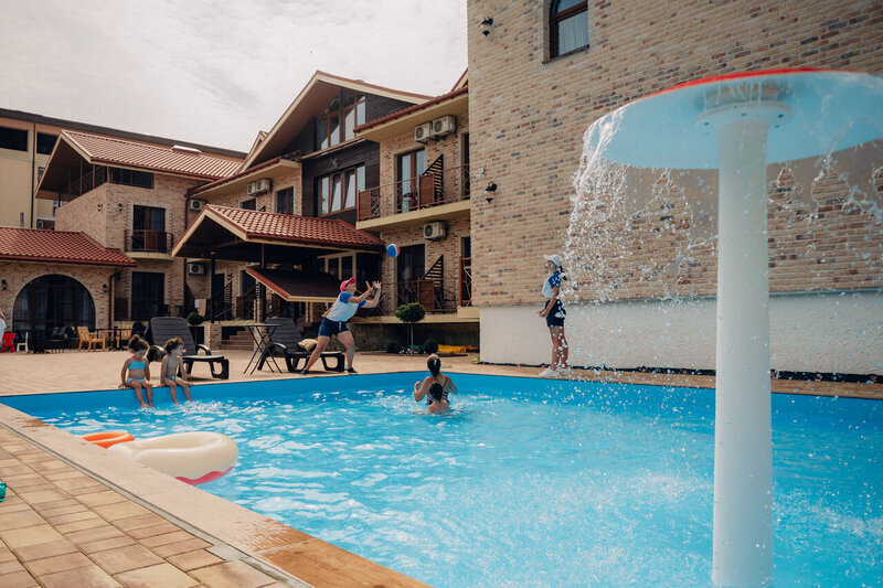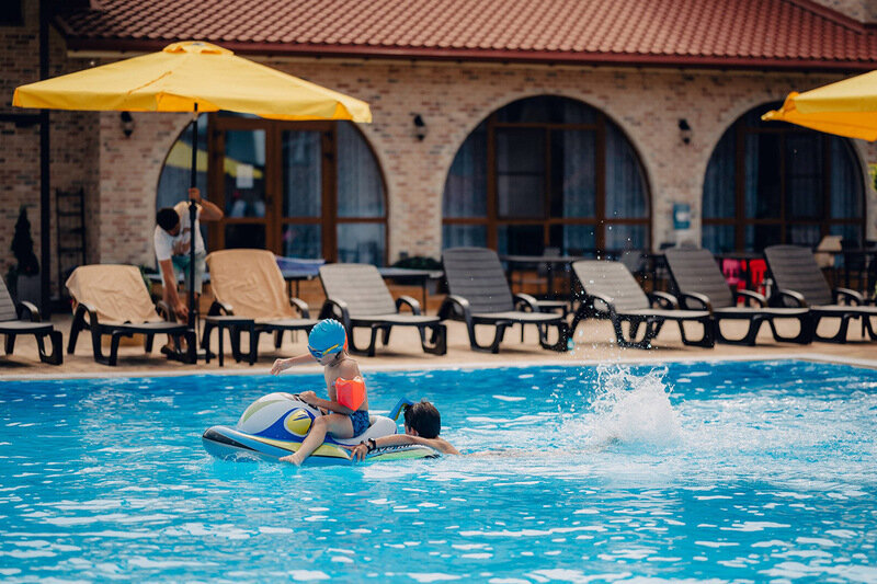 Для удобства гостей с детьми рядом с основным бассейном обустроен отдельный детский бассейн. Это позволяет родителям одновременно присматривать за малышами и наслаждаться собственным отдыхом.
