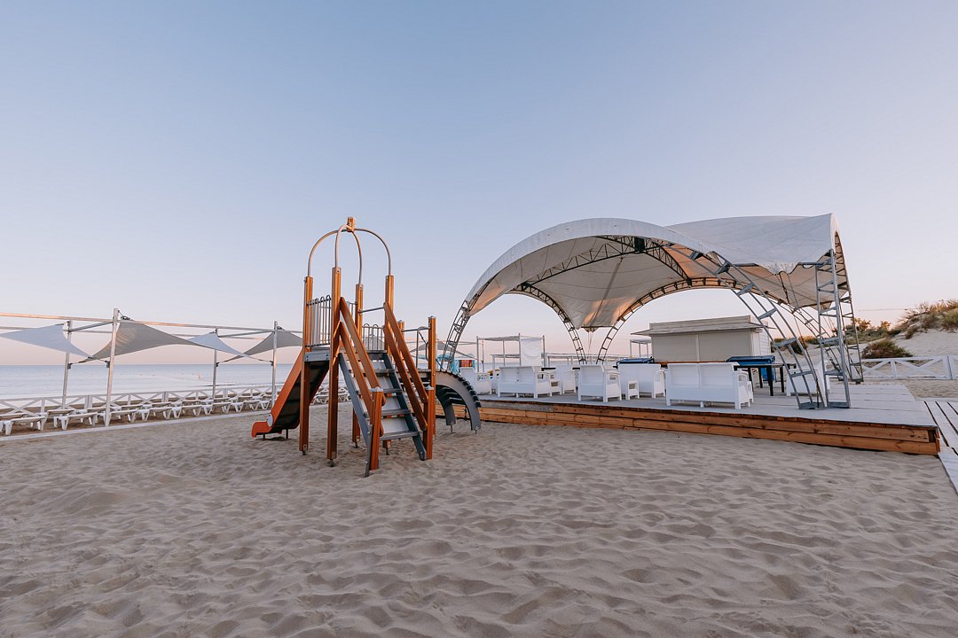 Проход к пляжу оборудован деревянными дорожками. Территория пляжа огорожена, вход осуществляется строго по гостевым браслетам отеля. Пляж оборудован: шезлонгами, навесами, зонтиками, кабинами для переодевания, туалетами и душевыми, детской игровой зоной, волейбольной площадкой. Имеется спасательный и медицинский пост.