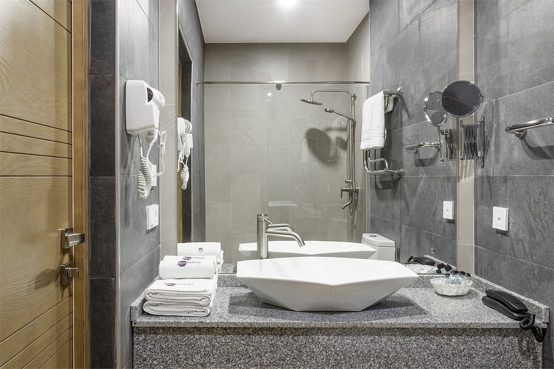 Wi-Fi, кондиционер, фен, электронные замки, халаты, банные полотенца, пляжные полотенца, тапочки, балкон, двуспальная кровать, шкаф для одежды, вешалки, зеркало, пуфики, две комнаты, чайный набор, сейф, чайник, унитаз, раковина, косметическое зеркало, питьевая вода, ковровое покрытие, душ, вид на город, вид во двор, туалетный столик, туалет, сушилка для белья, внутренний телефон, телевизор с плоским экраном, мини-холодильник, гостиничная парфюмерия, телевизор со Smart TV, номер для некурящих, чайная станцияВ гостиничном номере