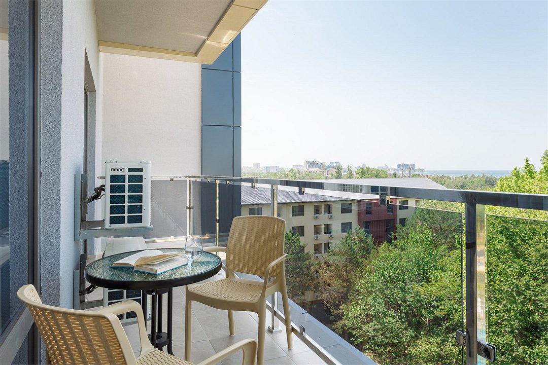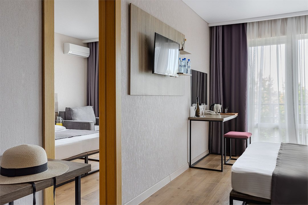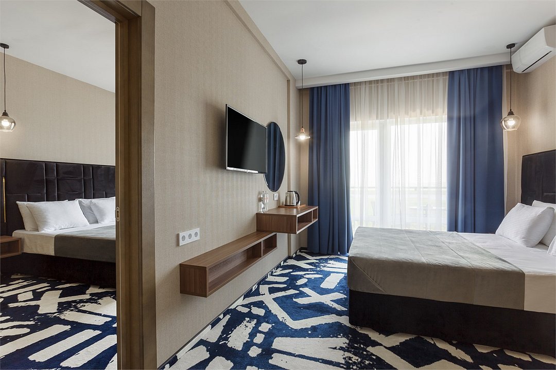 Просторный двухкомнатный номер с балконом. Номера расположены со 1 по 6 этажи в корпусе. В номере: две односпальные или одна двуспальная кровать, ТВ, холодильник, чайная станция, сплит-система, телефон, сейф, балкон с летней мебелью и сушилкой для белья. В ванной комнате: душ, раковина, унитаз, зеркало, фен, банные принадлежности и гостиничная парфюмерия.Услуги и удобства