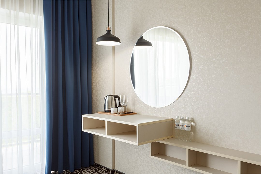 Wi-Fi, кондиционер, фен, электронные замки, халаты, банные полотенца, тапочки, балкон, двуспальная кровать, шкаф для одежды, вешалки, зеркало, две комнаты, чайный набор, набор посуды, сейф, унитаз, раковина, косметическое зеркало, питьевая вода, ковровое покрытие, душ, вид на город, вид во двор, стаканы, столовые приборы, туалетный столик, тумба, сушилка для белья, внутренний телефон, телевизор с плоским экраном, мини-холодильник, гостиничная парфюмерия, телевизор со Smart TV, чайная станцияВ гостиничном номере