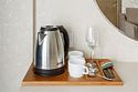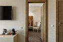 Wi-Fi, холодильник, кондиционер, фен, электронные замки, утюг, халаты, банные полотенца, тапочки, балкон, две односпальные или большая двуспальная кровать, шкаф для одежды, зеркало, сейф, чайник, унитаз, раковина, душ, вид во двор, ламинат, две ванные комнаты, раскладное кресло, внутренний телефон, телевизор с плоским экраном, гостиничная парфюмерия, номер для некурящих, чайная станция, вешалки-плечики, без питомцевВ гостиничном номере