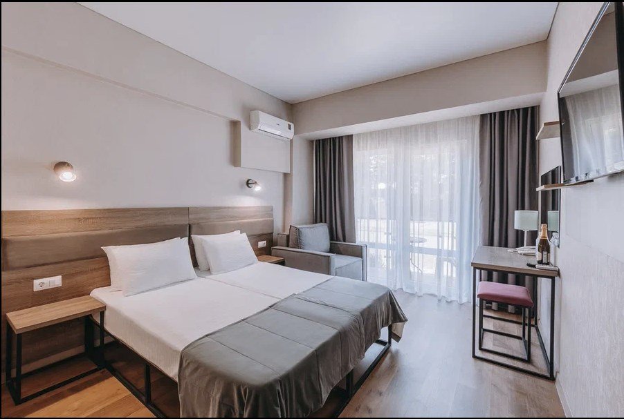 Wi-Fi, кондиционер, фен, электронные замки, халаты, банные полотенца, пляжные полотенца, тапочки, балкон, две односпальные или большая двуспальная кровать, тумбы, шкаф для одежды, вешалки, чайник, унитаз, раковина, косметическое зеркало, питьевая вода, ковровое покрытие, душ, вид во двор, внутренний телефон, телевизор с плоским экраном, мини-холодильник, гостиничная парфюмерия, телевизор со Smart TV, номер для некурящих, чайная станцияВ гостиничном номере