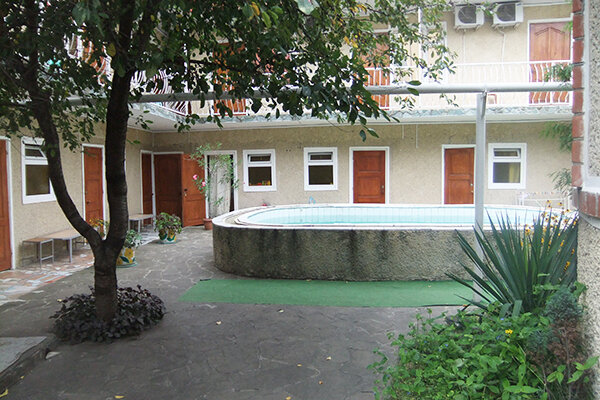 Гостевой дом «Испанский дворик» находится в 200 метрах от центра Анапы. До морского берега около 1000 метров. Жилой фонд гостевого дома способен одновременно вместить более 65 человек. Каждый номер оснащен удобствами, однако есть различия в категориях: например, «апартаменты» располагают отдельным санузлом с душем, а также набором бытовой техники: кондиционер или вентилятор, холодильник, телевизор. Удобства есть и в номерах «стандарт». В трехместных номерах гостевого дома есть собственные балконы.
