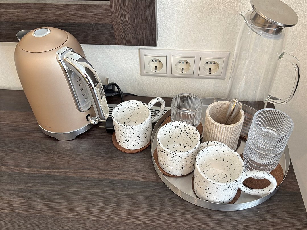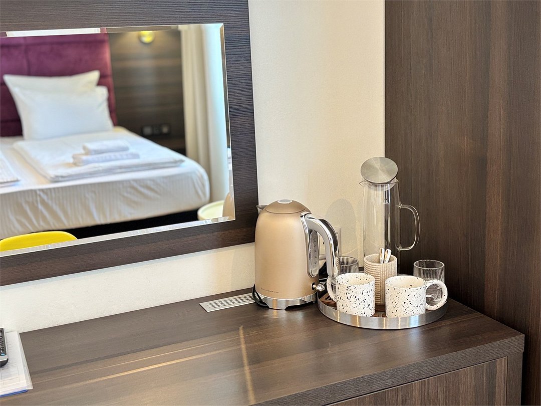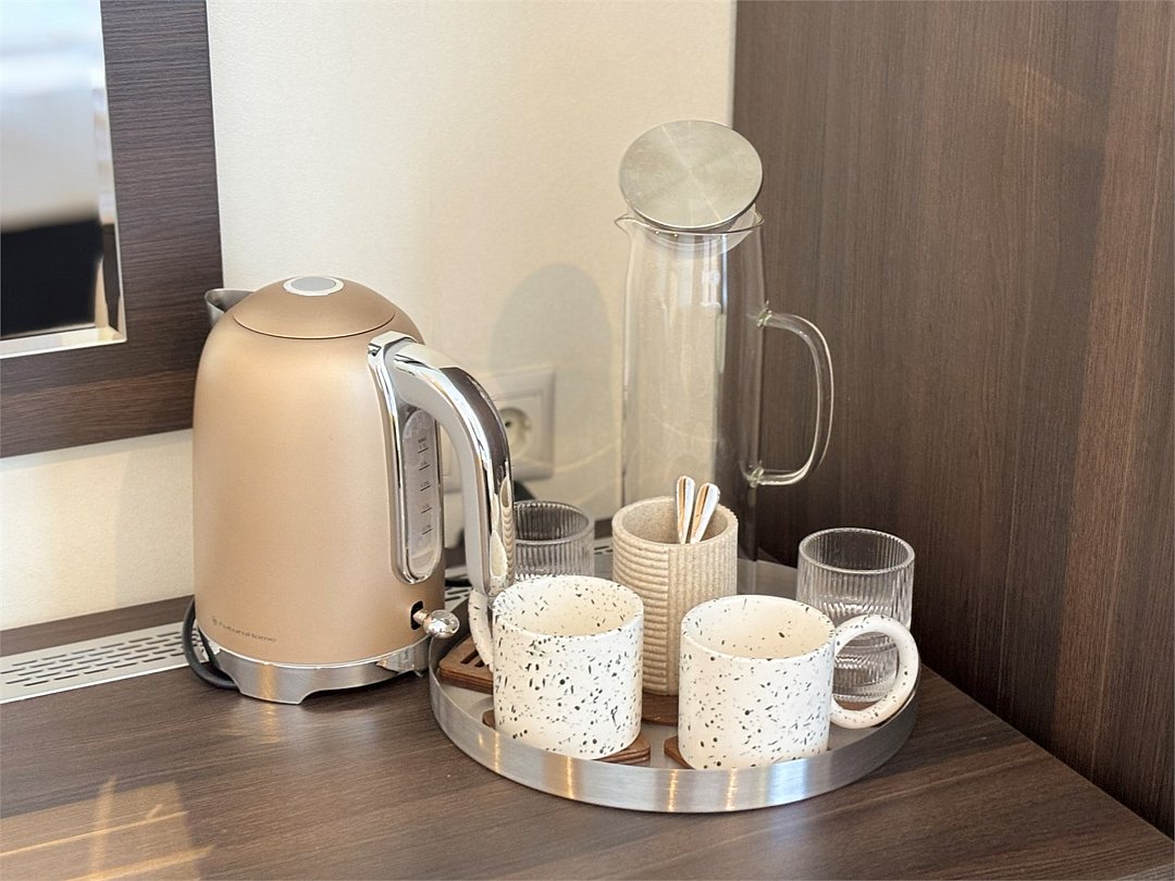 Wi-Fi, светильник, фен, электронные замки, душевая кабина, санузел, банные полотенца, тапочки, гигиенические средства, балкон, две односпальные или большая двуспальная кровать, шкаф для одежды, вешалки, багажная тумба, зеркало, чайник, унитаз, раковина, отопление, кулер на этаже, стул, туалетный столик, туалетные средства, сплит-система, сушилка для белья, телевизор с плоским экраном, мини-холодильник, москитная сетка, собственный бассейн, уборка номера, мылоВ гостиничном номере