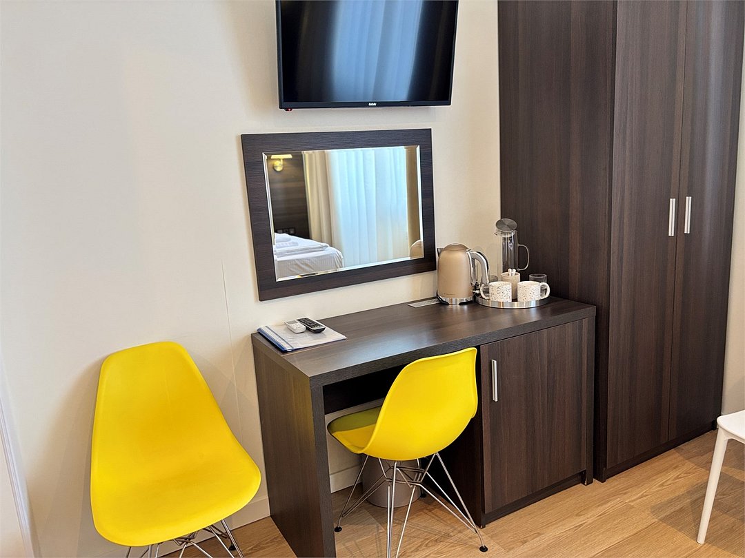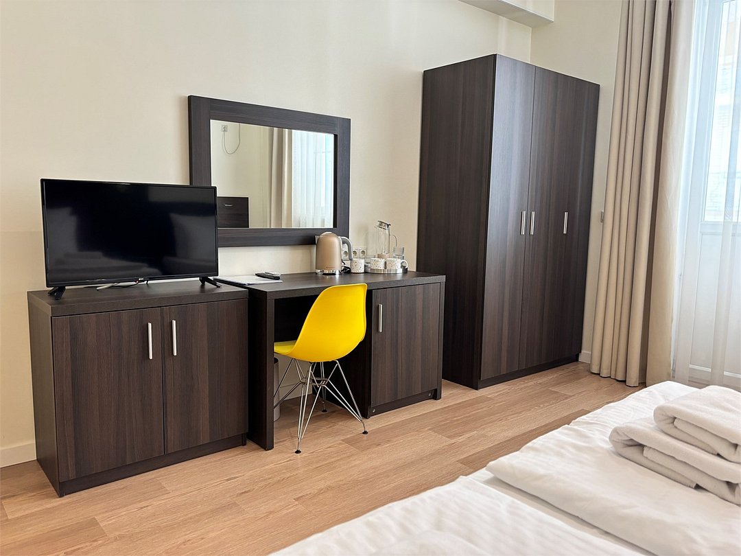 Wi-Fi, холодильник, кондиционер, душевая кабина, санузел, банные полотенца, гигиенические средства, балкон, двуспальная кровать, шкаф для одежды, багажная тумба, зеркало, отопление, кулер на этаже, телевизор с плоским экраном, москитная сетка, общественный бассейн, уборка номераВ гостиничном номере