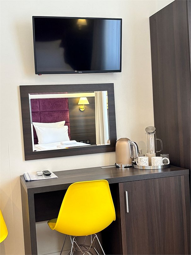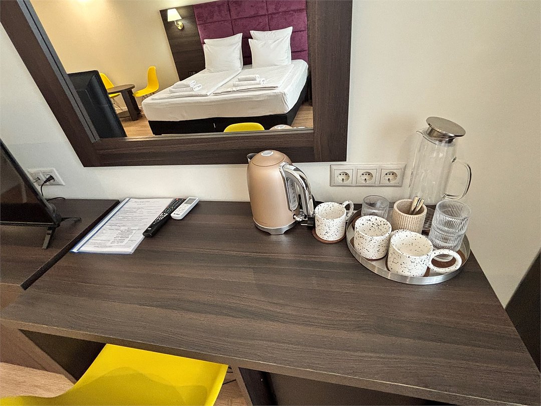 Однокомнатный номер с душем и балконом. Дизайн в классическом стиле. Подходит для проживания 1 - 2 человек + ребенок до 8 лет. На этаже расположены кулер с холодной, горячей водой и гладильная доска с утюгом. Чтобы воспользоваться микроволновкой, обратитесь к администратору. На территории летний бассейн с детской чашей и подогревом воды. Рядом с отелем находится Аквапарк "Тики-Так".Услуги и удобства