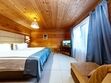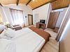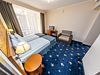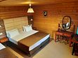На окне стоит москитная сетка. Сам номер это одна комната, примерно четверть которой занимает большая двуспальная кровать. Рядом с кроватью с одной стороны широкое кресло-кровать (во всяком случае по виду оно должно раскладываться), с другой - тумбочка, на которой подставка под электрический чайник и пара стаканов. Над креслом кондиционер (обычный, без системы вентиляции). Чайник не большой, по сути его хватает чтобы наполнить 0,5-0,6л бутылку водой. С каждой стороны кровати своя небольшая лампа и одна розетка (с одной стороны занята чайником, придётся переключать). Перед кроватью есть стол с телевизором, под ним за дверцей маленький холодильник. Под столом 2 розетки, если и холодильник и телевизор используются, то обе заняты. Перед комнатой небольшой коридорчик со шкафом, стенкой с вешалками (вешалки высоко, не все достанут) и полкой под обувь. В коридор же выходит дверь ванной.