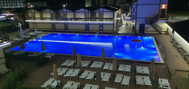Бассейн работает с 8:00 до 21:00. Бассейн с подогревом, температура воды поддерживается на уровне 27С. Но подогрев могут выключить, во всяком случае на время чистки фильтров. Потом включают обратно. В районе бассейна есть табло, показывающее текущее время, температуру воздуха, температуру воды в бассейне и в море.
