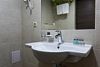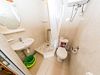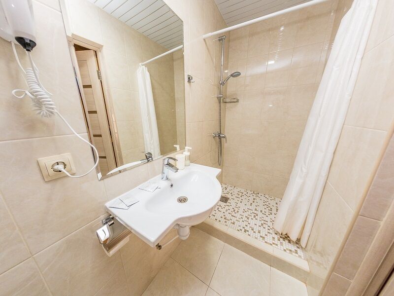 Сан.узел совмещённый, в нём есть держатель для полотенец (расположен довольно высоко, невысоким людям будет не удобно), большая раковина, рядом с ней есть крючок чтобы что-то повесить. Зеркало над раковиной и душ с поддоном. Полочки у раковины нет, но пространства на ней самой должно быть достаточно, чтобы разместит нужные средства. Хотя, конечно, это зависит от того, что нужно размещать. Душ отгорожен сплошной шторкой, достающей почти до пола, но она всё-равно не спасает от того, что пол после принятия душа частично будет мокрым. Сам душ довольно удобный, снимается, есть регулировка по высоте, есть полочка под шампунь и т.п. При заезде там было несколько пакетиков с шампунем и гелем. Их пополняли по мере того, как они заканчивались (если заметили, что пора пополнять, то можно попросить уборщицу, и пополнят). Так же в ванной стоит одно маленькое ведро под мусор. И есть фен на стене около раковины. Раковина обычная, без пробки, чтобы можно было набрать воды (бывают такие). То есть что-то слегка постирать может быть не удобно. Кран низкий и короткий, может быть не очень удобно. Освежителя нет.