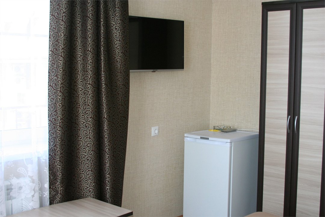 Wi-Fi, холодильник, настольные лампы, фен, банные полотенца, тапочки, балкон, двуспальная кровать, односпальная кровать, диван, тумбы, стулья, шкаф для одежды, письменный стол, зеркало, чайный набор, чайник, унитаз, раковина, питьевая вода, отопление, отдельный вход в номер, вид во двор, ламинат, стаканы, туалетные средства, сплит-система, телевизор с плоским экраном, москитная сетка, услуги прачечной (платно), шапочка для душа, мылоВ номере