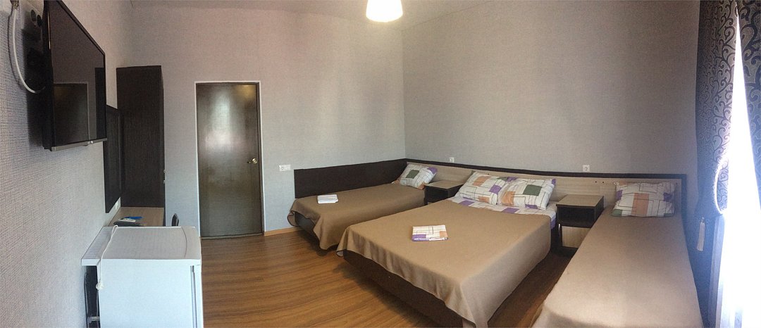 Wi-Fi, холодильник, ванна, банные полотенца, двуспальная кровать, две односпальные кровати, тумбы, стулья, шкаф для одежды, журнальный столик, письменный стол, зеркало, чайник, унитаз, раковина, питьевая вода, отопление, вид на город, вид во двор, ламинат, высокие потолки, стаканы, туалетный столик, туалетные средства, сплит-система, диван-кровать, раскладной диван, телевизор с плоским экраном, москитная сетка, номер для некурящих, услуги прачечной (платно), вешалки-плечикиВ номере
