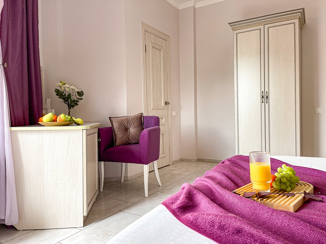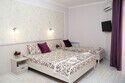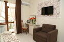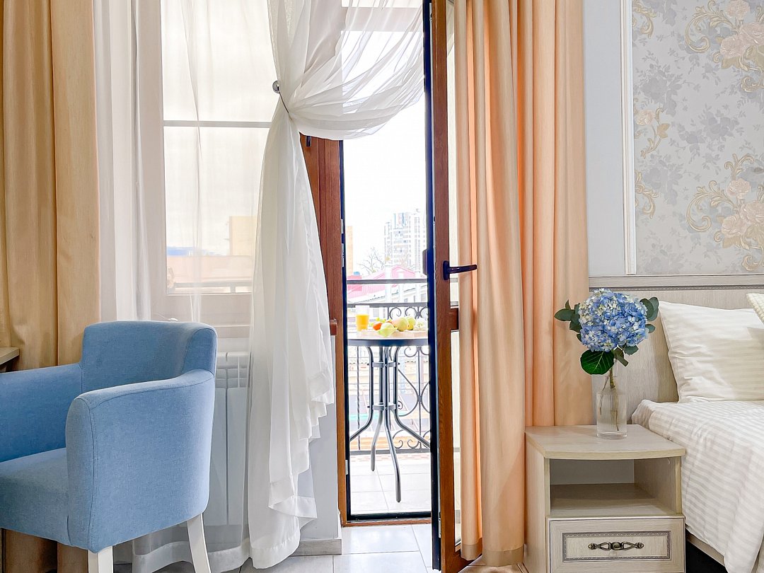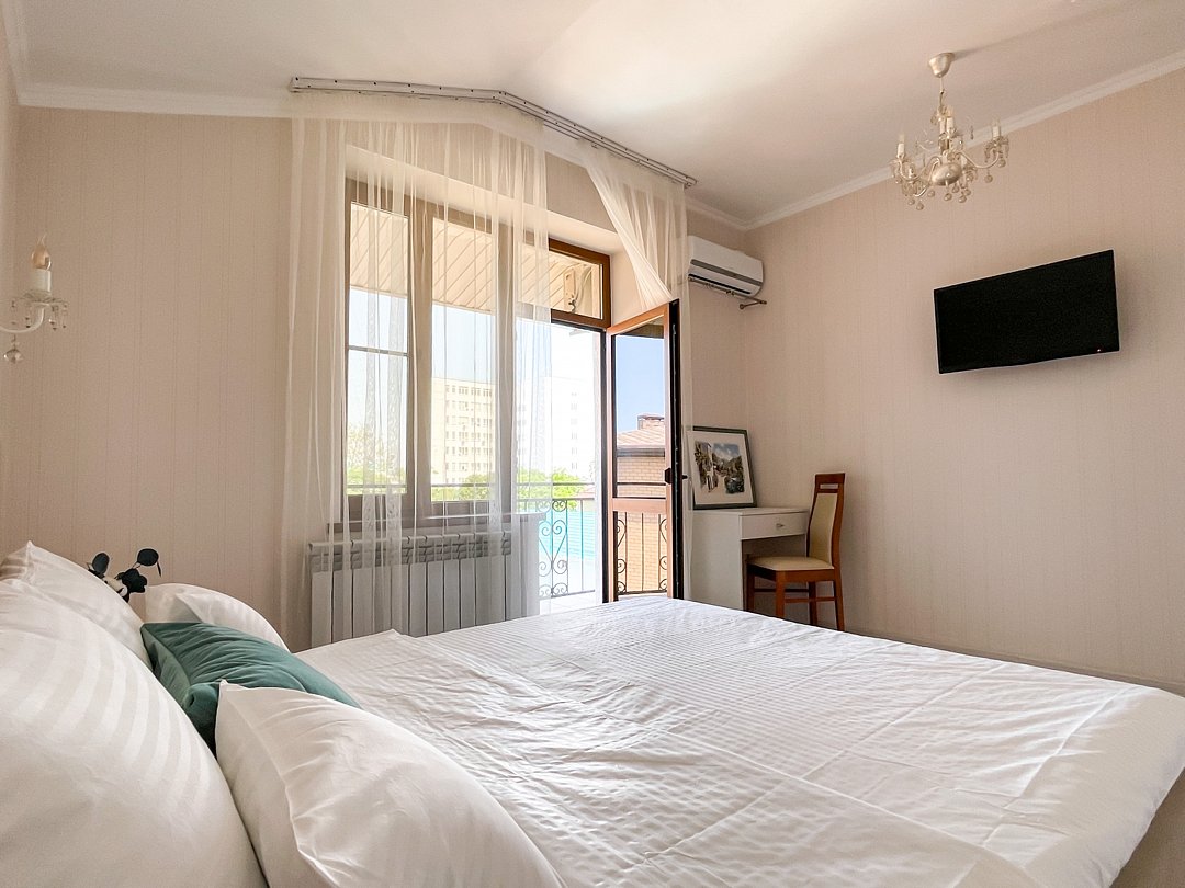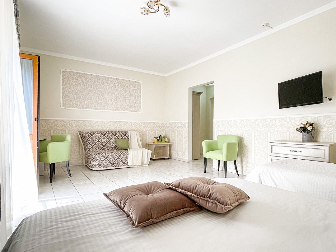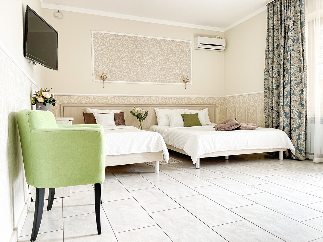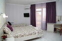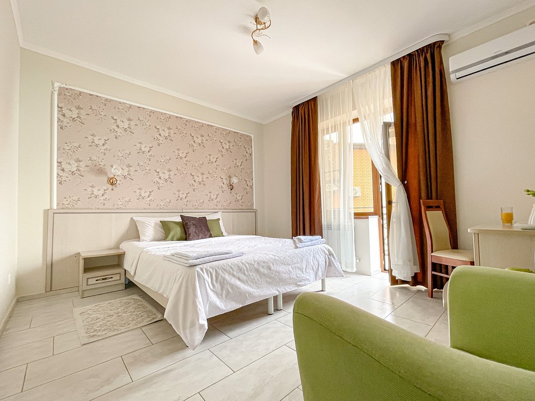 полулюкс четырехместный номер Номер с большим балконом: две односпальных кровати (или двуспальная кровать) с ортопедическими матрацами, диван-кровать, телевизор, WI-FI, холодильник, чайник, сплит-система, набор посуды, шкаф для одежды, стол, стулья, постельные принадлежности. Ванная комната: душевая кабина, санузел, туалетные принадлежности, набор полотенец.В номере