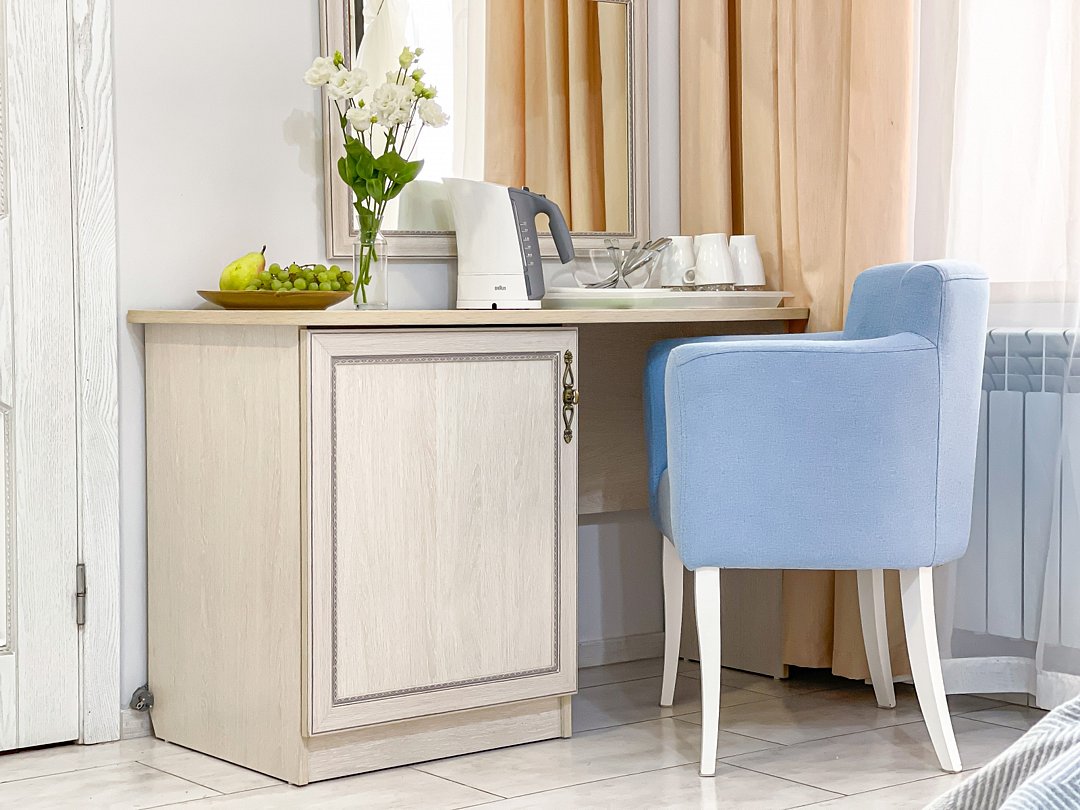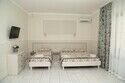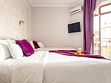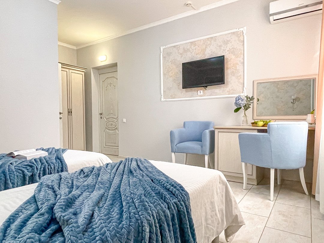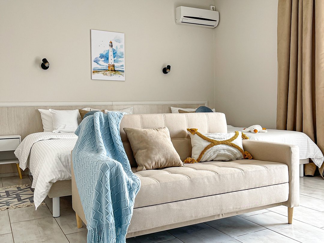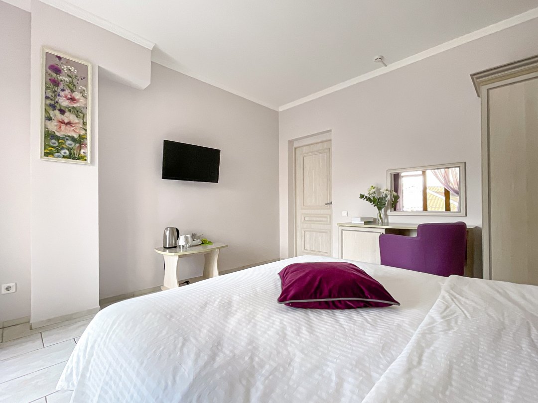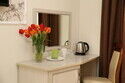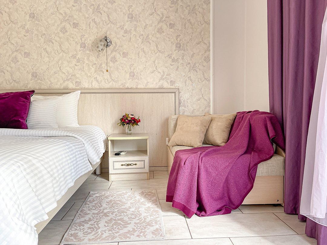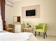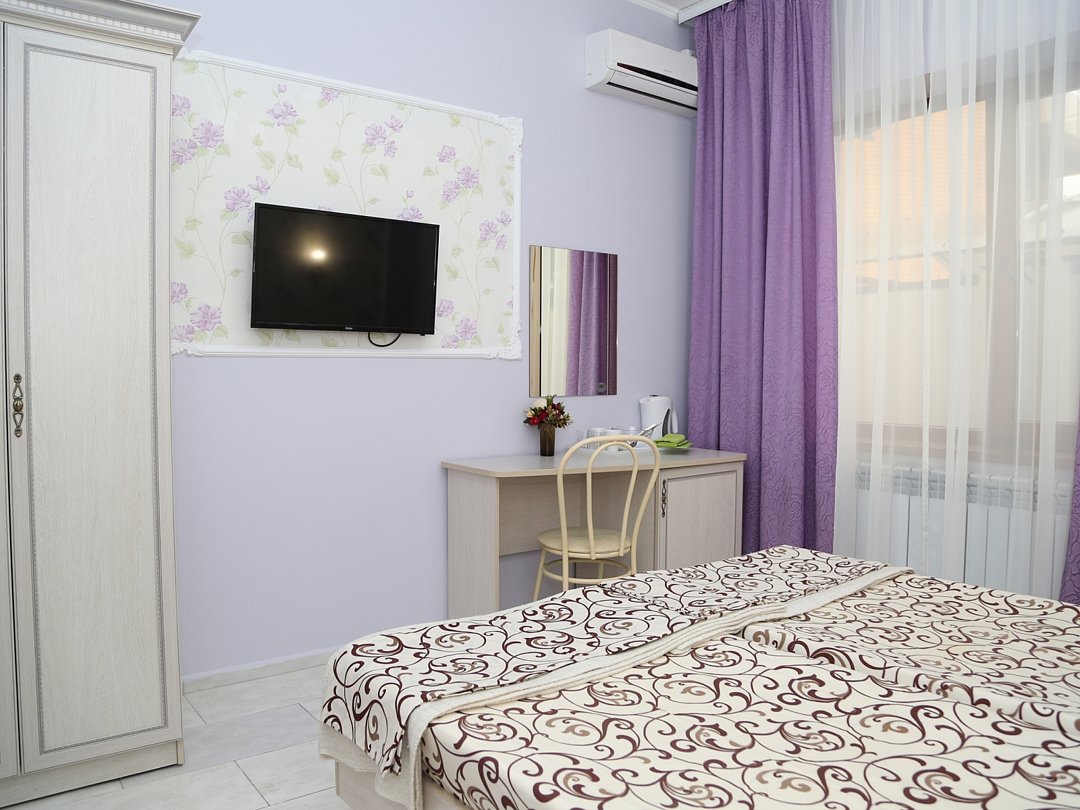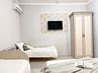 полулюкс четырехместный номер Номер с большим балконом: две односпальных кровати (или двуспальная кровать) с ортопедическими матрацами, диван-кровать, телевизор, WI-FI, холодильник, чайник, сплит-система, набор посуды, шкаф для одежды, стол, стулья, постельные принадлежности. Ванная комната: душевая кабина, санузел, туалетные принадлежности, набор полотенец.В номере