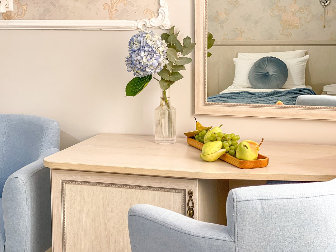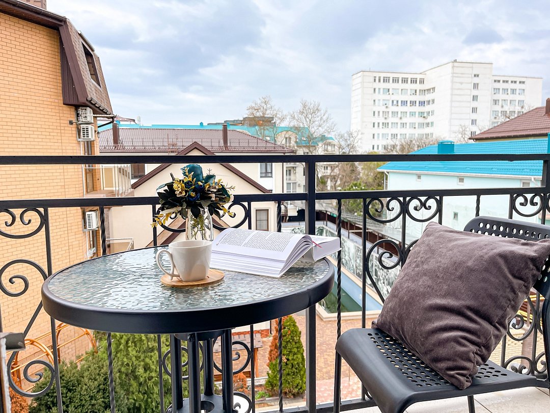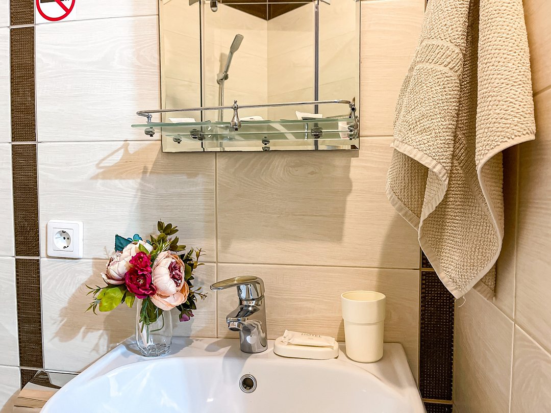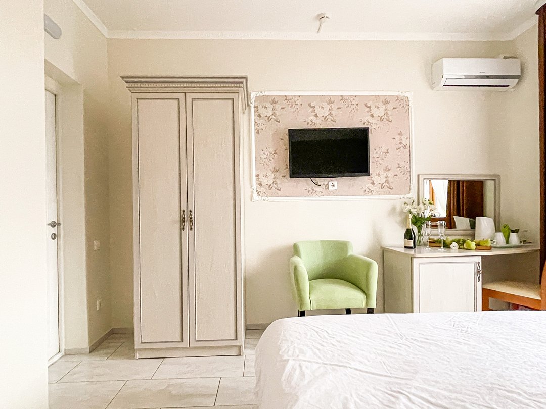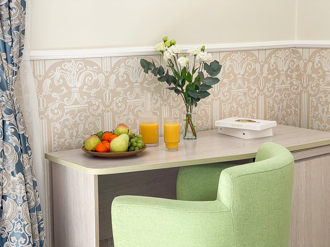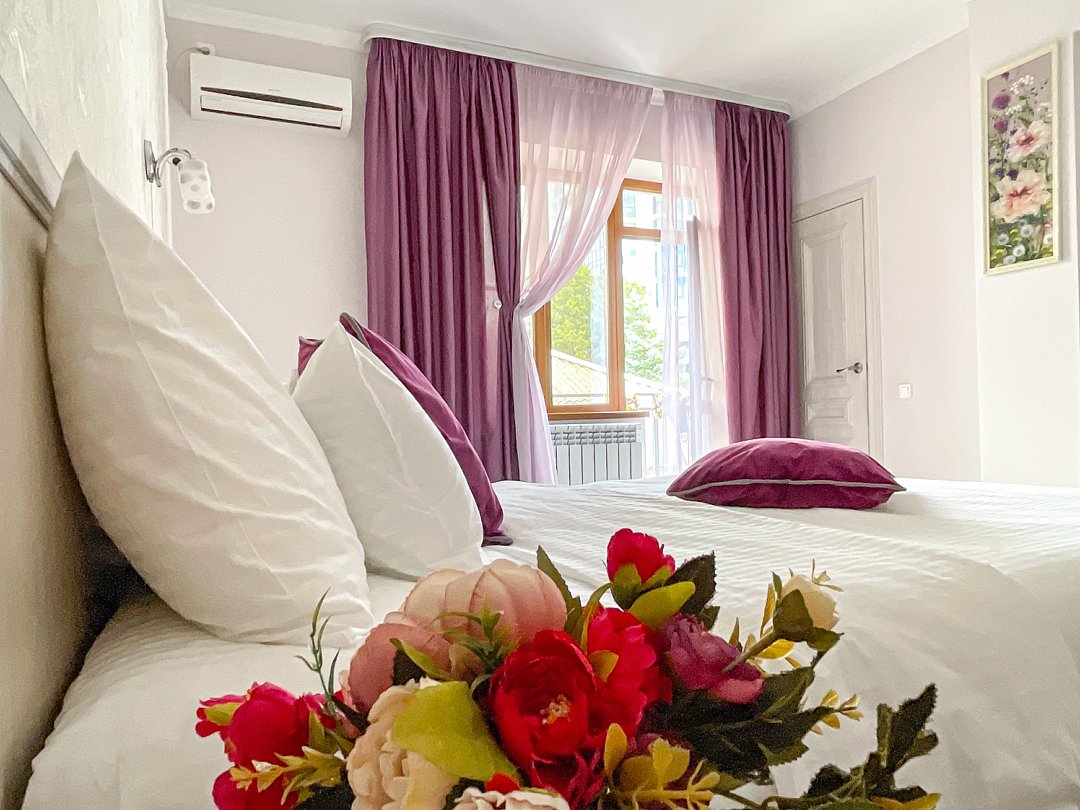 полулюкс четырехместный номер Номер с большим балконом: две односпальных кровати (или двуспальная кровать) с ортопедическими матрацами, диван-кровать, телевизор, WI-FI, холодильник, чайник, сплит-система, набор посуды, шкаф для одежды, стол, стулья, постельные принадлежности. Ванная комната: душевая кабина, санузел, туалетные принадлежности, набор полотенец.В номере